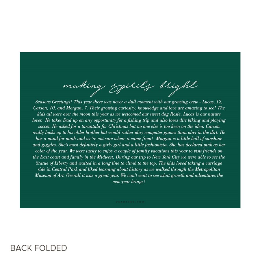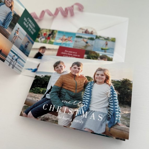Got photos? These folded Christmas cards have room for lots. And we mean lots and lots. One large photo fills the front, decorated with a holiday greeting that's waiting for you to personalize. Inside there are spaces for 16 smaller photos, perfect for Instagram-size or smaller mobile photos. That's a total of 17 photos in all! We hope you have lots to share. What's more, you can add your own messages in the editable text blocks, and change the background colors to accent your photos. On the back, there's room for a longer more personal greeting with all the news of your year. You can choose from a kraft paper background, chalkboard, or a solid color of your choice. Have fun filling these Christmas cards with all the moments, big and small, that made up your year.
