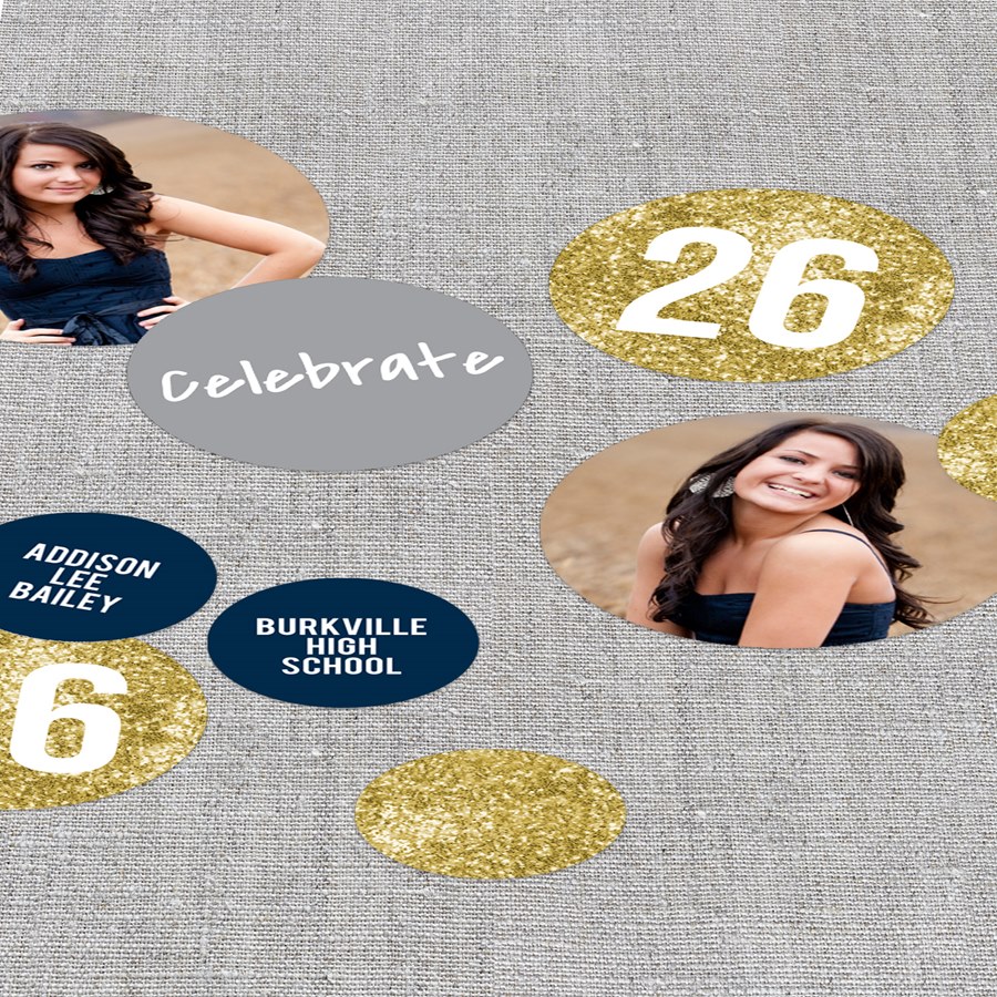 Glam up your grad party with personalized graduation party decorations. Each piece is double-sided, and can be customized with the colors, wording, and fonts of your choice. The back sides of all pieces feature the gold glitter pattern. Use these graduation party decorations as centerpieces, table confetti, or string them to make garland. You can even use the little ones as cupcake toppers.