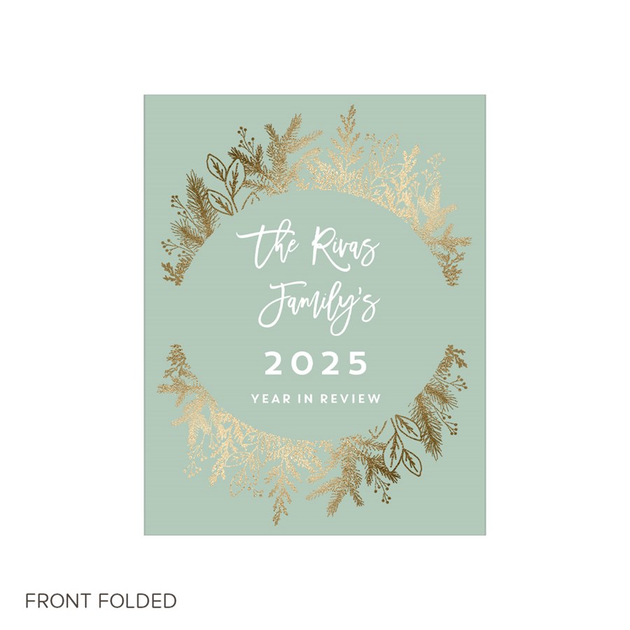 Room for all your family news all wrapped up in glam holiday style! This trifold Christmas card holds 14 photos and lots of fun family updates. The front panel of this folded card features holiday greenery printed in digital gold ink, surrounding your own custom wording. You can update the background color and all the editable text to create a card with your own custom touch.
