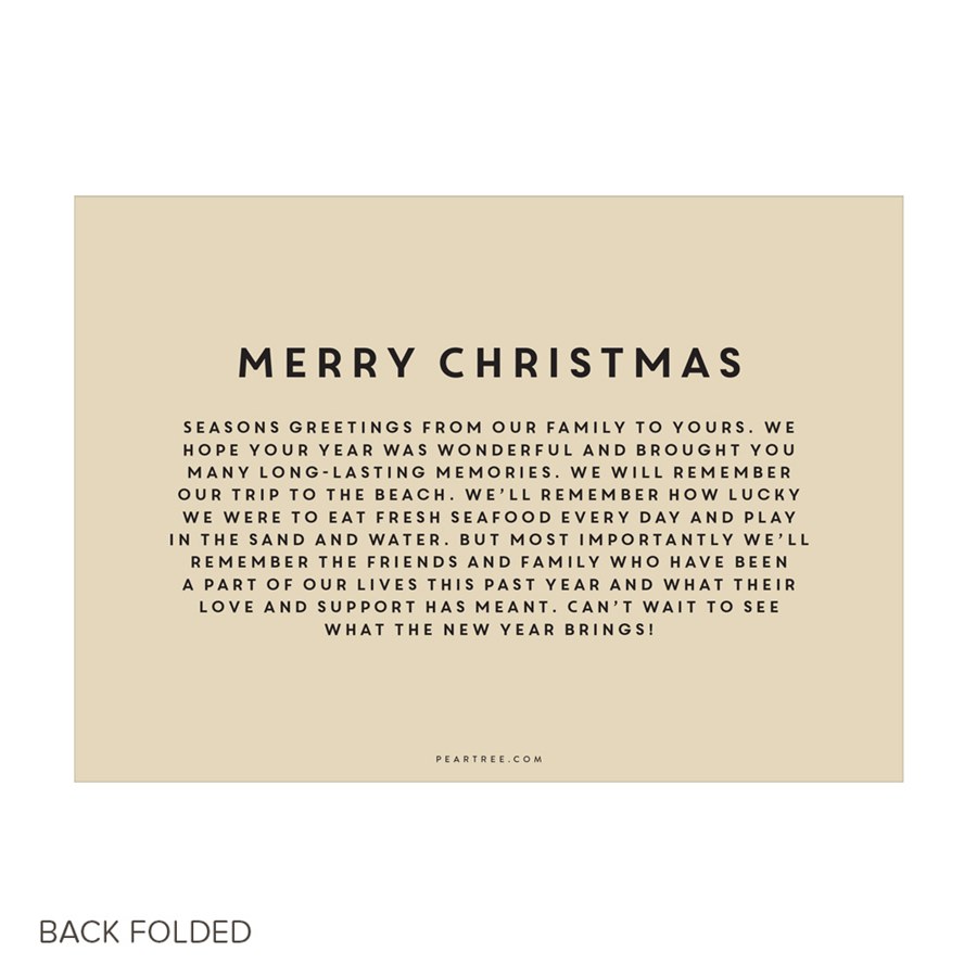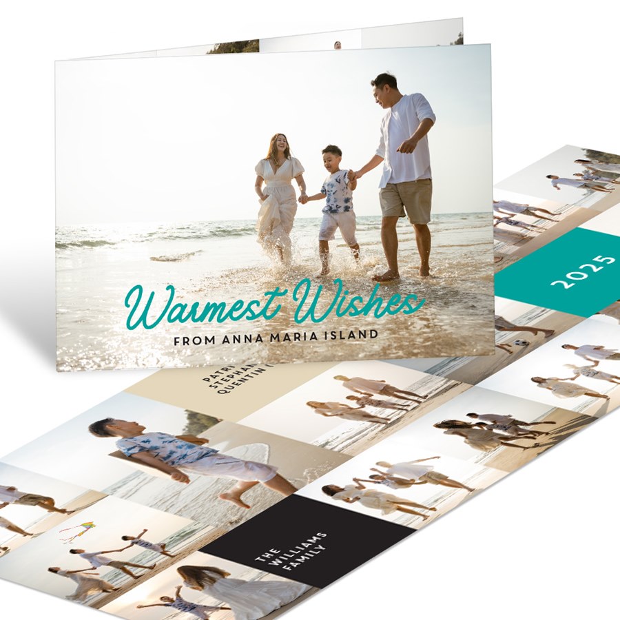 A large folding holiday card gives you four spatious panels for your photos and personalization. Blocks of solid colors add a fun and festive element to the design. "Warmest Wishes" is printed in the font shown in your choice of color on the large feature photo. You get to choose from more than 80 colors for each block! Perfect for your Beach Christmas photos!