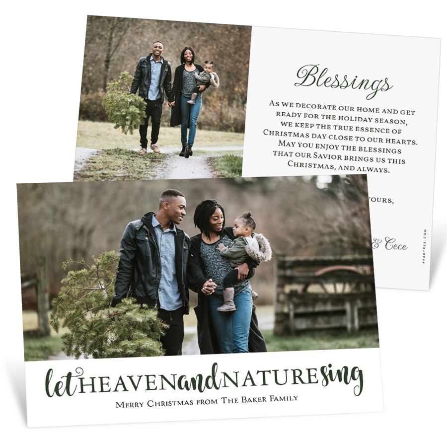 The verse to one of your favorite Christian Chirstmas songs, Joy to the World, is elegantly illustrated below your choice of photo on the front of these Heaven and Nature Christmas cards. The verse is printed in the font shown in your choice of color above your personalization. On the back, you can choose no photo, one photo or multiple photos and you can choose from a variety of patterns or colors for the background. All text is editable on the back with choice of fonts and colors. Check out our entire selection of Religious Christmas Cards!