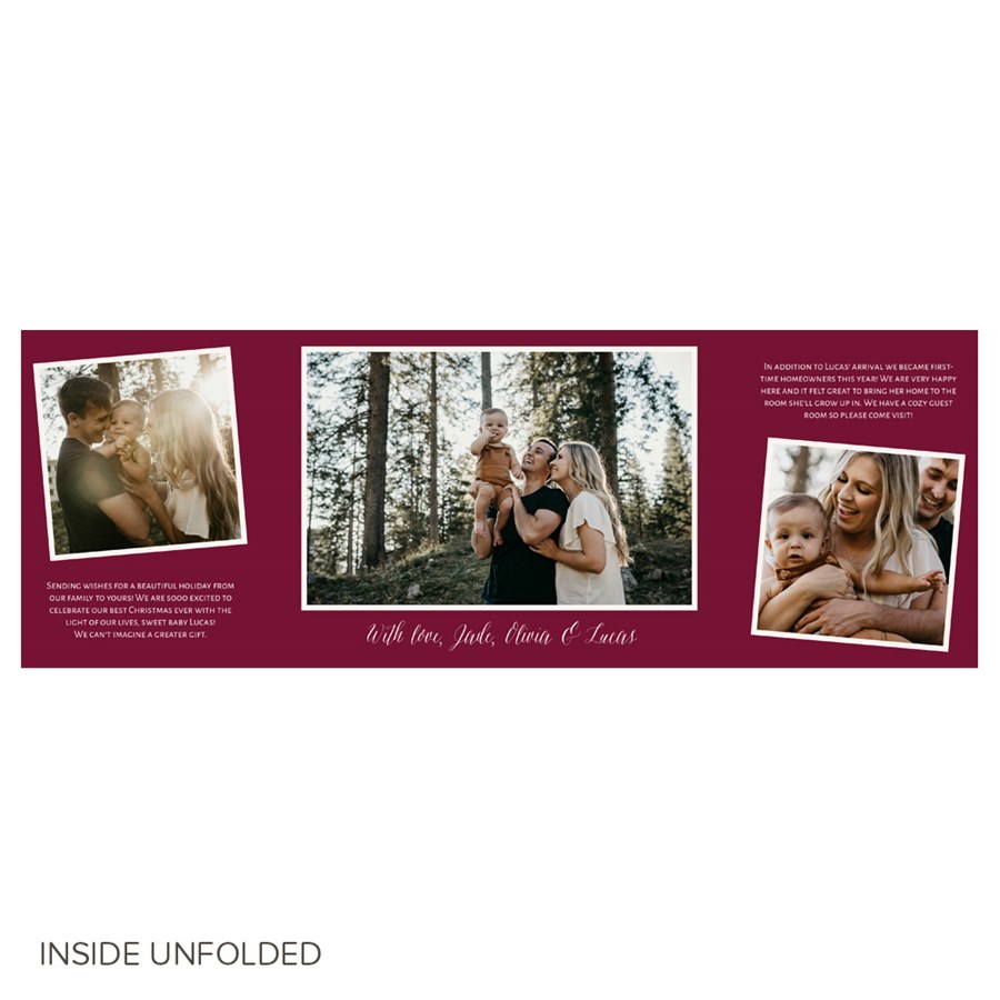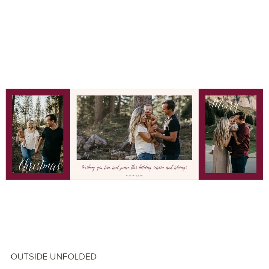 Wish your loved ones a Merry Christmas in unique style with this folding Christmas card. This fun design opens like a gift to reveal family photos and your own custom message. All the colors on this design - including the background and text - can be updated for a custom look.