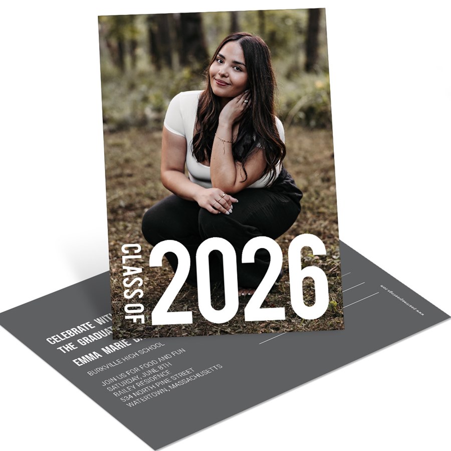 Looking for an easy but fun design for your photo graduation announcements or invitations? Try this Big Year vertical postcard! With your best vertical photo on the front, along with a screened overlay of your class year in your choice of colors, this custom postcard says it all on just two sides. The back has room for your future plans or party details, along with mailing address. Choose from over 80 colors for the background. It's super easy and fun to create your very own custom graduation announcements. And don't forget, you can order risk free with our happiness guarantee.