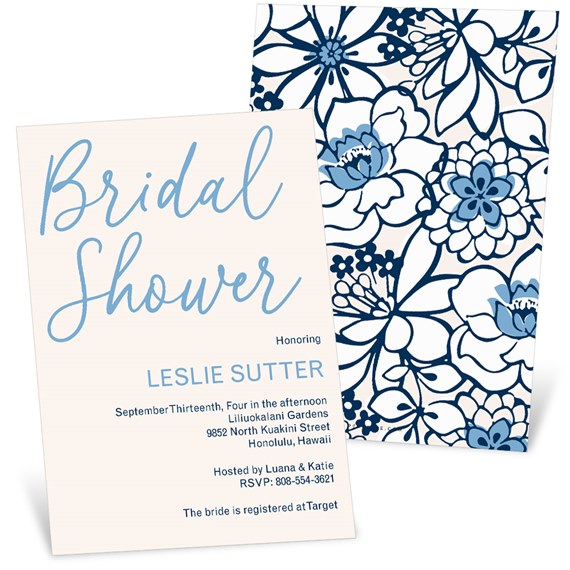 A garden of blooms bursts onto the back of these bridal shower invitations to the delight of your guests. The colors of the floral artwork on the back can be customized to match your wedding or bridal shower decorations. The front features a unique font announcing the shower, and gives you plenty of room to add all the shower details below in your choice of colors. Simply pick a color and add the details to personalize these bridal shower invitations. And if you like these, check out our matching wedding invitations!