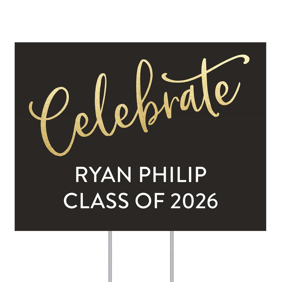 Celebrate your grad with a party detail that’s both functional and fun! This custom yard sign features a faux gold glitter “celebrate” against the background color of your choice. Update the text below to feature your graduate’s name, graduating year or anything you choose. This yard sign is made from weatherproof, corrugated board and includes a metal H stake for mounting and inserting into the ground. Yard signs are shipped separately from the rest of your order.