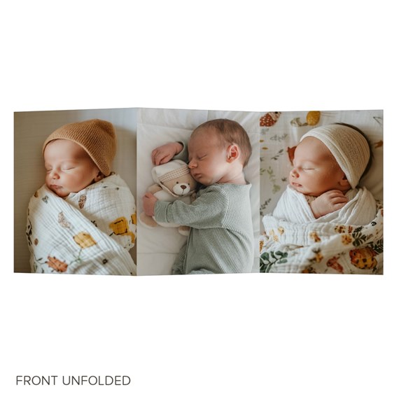 Three of your adorable photos line up on the front of these trifold Christmas birth announcements for triple the fun. Upload your three favorite photos, and have fun deciding which ones to use. On the back, the first panel is covered in swashes of red paint, and all the details of your baby's birth, as well as your personal Christmas message, printed over the color. You can change the red color on this side to another color, as well. One large horizontal photo fills the remaining two panels, completing these simple Christmas birth announcements that are packed with joy.