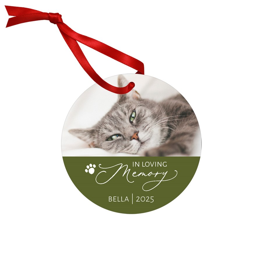 If you've lost a pet this year, memorialize them forever with a photo Christmas ornament designed especially to honor your pet's memory. The phrase "In Loving Memory" is printed on this design, along with your pet's name and year. You can change all the colors on this personalized ornament. This round ornament is 2 3/4 inches in diameter and made of lightweight .045" coated aluminum with a glossy finish. Your photos are infused into the coating using a revolutionary process that results in vibrant colors and detail. A red ribbon is included for hanging.