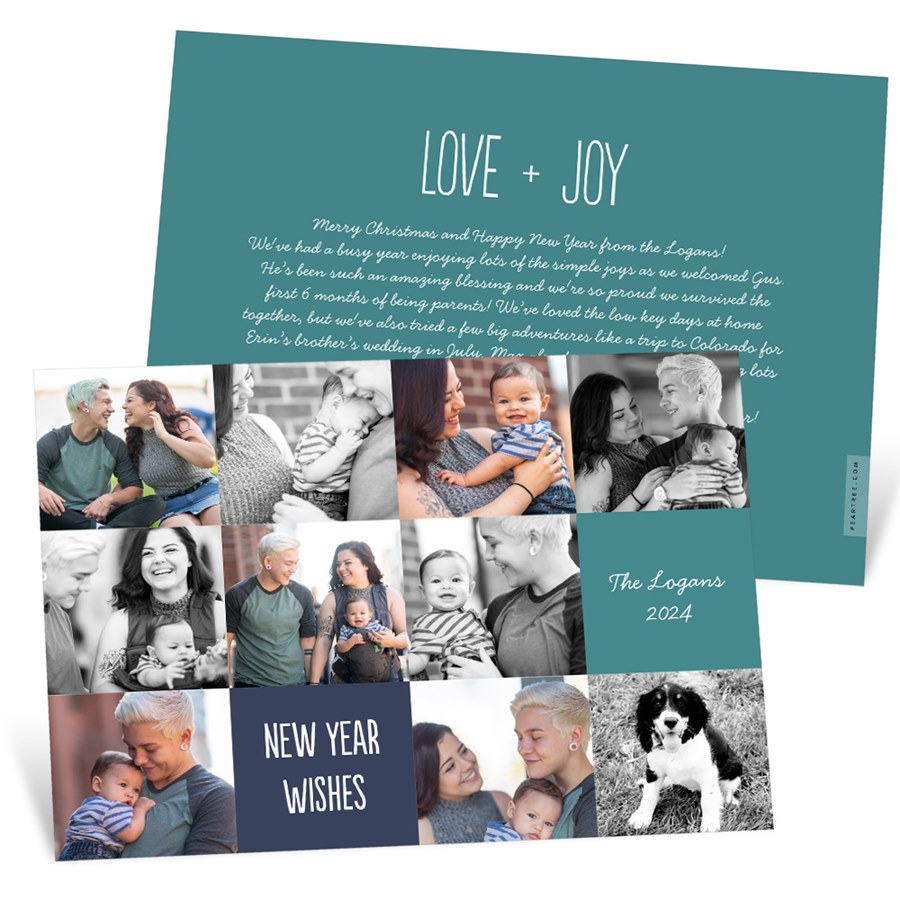 Wish your loved ones a Happy New Year with a photo card that holds lots of pictures! This cute photo-collage New Year's card holds ten photos on the front side. You can update the colors, text and fonts on the two non-photo squares to reflect any greeting you'd like. On the back, you can choose from a variety of layout options - including options with no photo or multiple photos - as well as fun patterns or a solid color for the background.