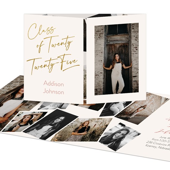 Their graduation day has arrived! Announce their graduation and invite to the party with this Class Statement foil-stamped Graduation Invitation. This gatefold design doubles as a graduation party invitation features their graduation year stamped in your choice of gleaming metallic foil color. All the other colors can be updated to suit your style. Full of lots of photos and fun colors, this unique design is a perfect choice for this big moment.