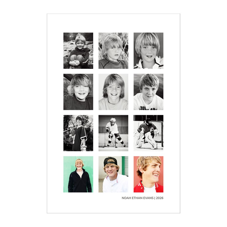 This graduation photo poster makes sharing photos so easy! Large-scale, this 36" x 24" poster features a collage of 12 photos; perfect for showing how they’ve grown. You can update the background color to fit your grad party theme or school colors, and change the editable text to say anything you’d like.