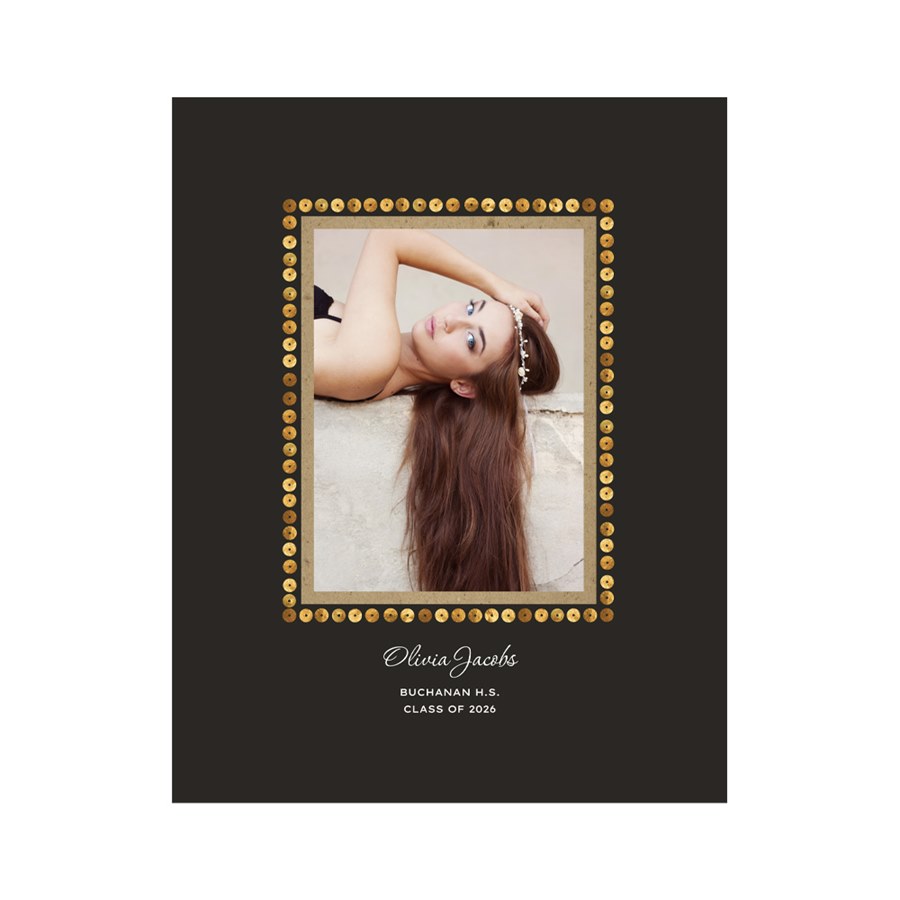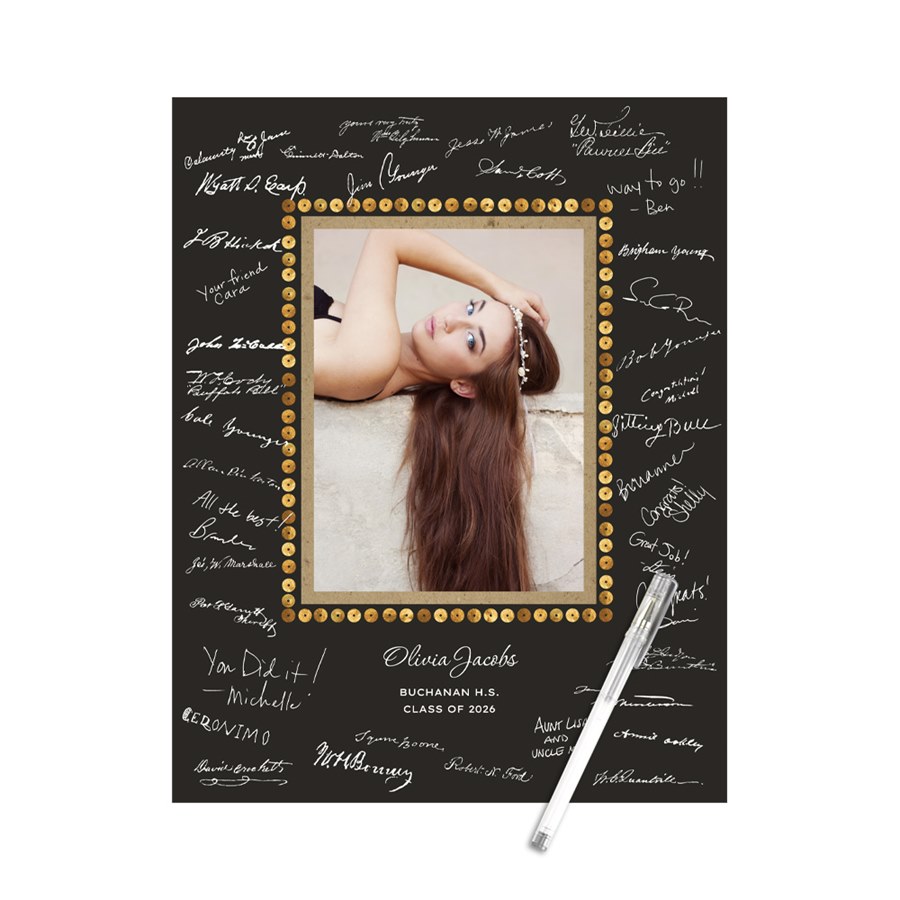 It's like a guest book only much better looking! This guest book print will be something you'll want to frame and keep long after your graduation party is over. The gold sequin-look matches many of our graduation invitations and party decorations, and the activity will add to the fun at your party. Just hang or lay it where guests can sign it, and let the fun begin. The 11" x 14" design can be personalized with your photo in the center frame and editable text below it, which you can change or leave blank if you prefer. The inner frame around the picture can be changed from kraft paper to gold or silver faux foil or a gold glitter-look foil. The gold faux sequin border cannot be changed. And for the background you can choose from over 80 different solid colors to match your party colors, your room decor, or simply complement your photo. It's the perfect way to create a memento of your party.