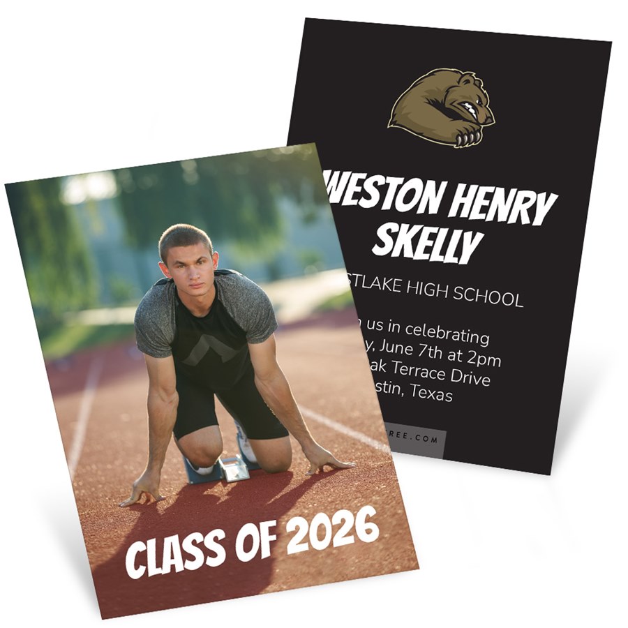A strong design that gets to the point. These mini graduation party invitations feature a full photo on the front with "Class of 2022" below in your choice of font and color. The backside has room for some school pride by adding a mascot or logo at the top and your party details below, all against a background color of your choice. All text is editable with choice of fonts and colors. Adding a logo or mascot is optional. You can choose to add a text box, a photo box or leave it blank. Use the icons at the top when you're personalizing to add your chosen element. These pocket-size invites are too small to mail, but are perfect for handing out at school.