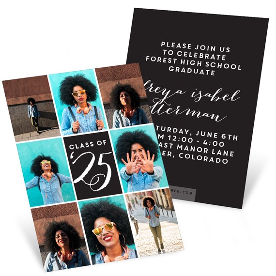 Who knew you could fit so many photos on such a cute little card! These mini graduation party invitations are designed to impress friends and classmates by giving you plenty of space to show off your personality. Eight photos on the front with "Class of [year]" in your choice of color against your choice of background color. The backside of the Photo Squares invite features your party details in your choice of colors and fonts against your choice of background color. These pocket-size invites are too small to mail, but are perfect for handing out at school.