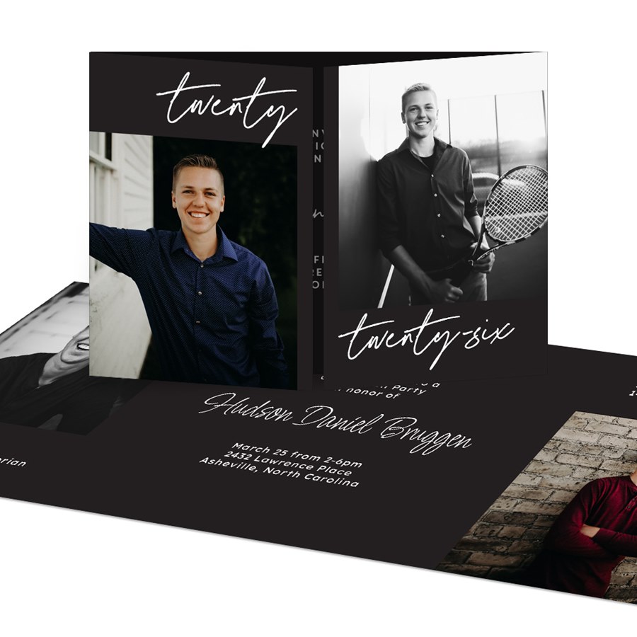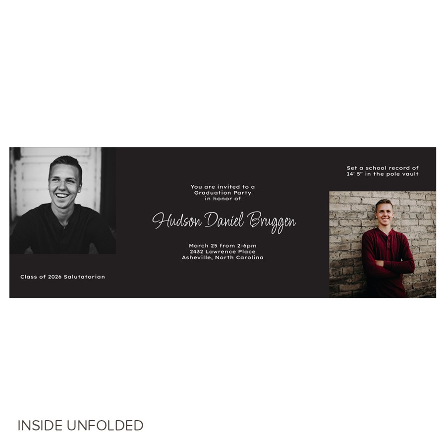 They're graduating - announce it in sweet style! This Classy Grad gatefold Graduation Party Invitation is super unique and can be customized to suit your style. Add five photos then share anything you'd like - graduation party details, future plans, high school accomplishments and more. You can update the entire color palette on this invitation to create a look that matches school colors or your senior's own personal style.