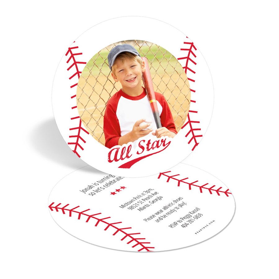 Who's the star of this birthday party? Let there be no doubt! These baseball-themed kids birthday invitations featuring your little all-star's photo in the center are just perfect for any kid who loves baseball! Simply choose your favorite up-close photo to put in the center, and add your party details on the back. You can also change the color of the text and laces. It's super easy and fun to create kids birthday invitations that are uniquely yours.