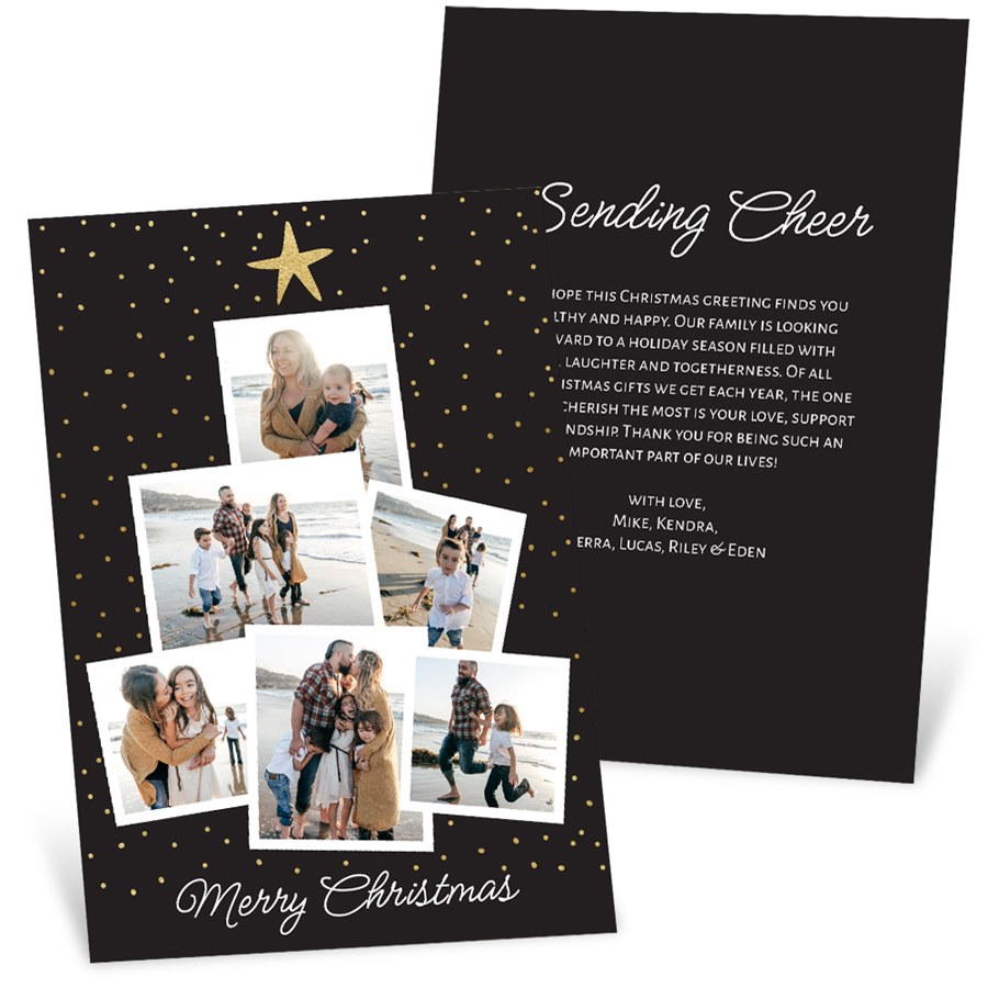 A Christmas tree of family photos is a sweet way to celebrate the season! This Trimmed with Cheer Christmas card features a collage of photos, topped with a star. The gold details on this photo card are printed using golden ink. All the other colors on this card can be changed to fit your style. You may also personalize this photo card and create a custom look with endless layout, photo, design and text options.