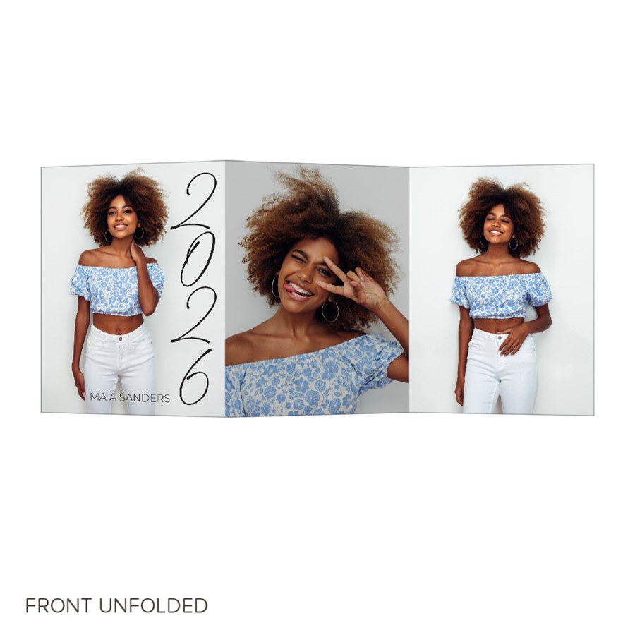 This Scrawled Year, trifold graduation announcement lets you show off lots of photos and doubles as your graduation party invitation. The front side of this design features your senior's graduation year - in any color you'd like - and three pictures. You can also customize the backside. Choose your colors, fonts and add all the details you wish to share. With space for 6 more senior photos, this design is truly one-of-a-kind.