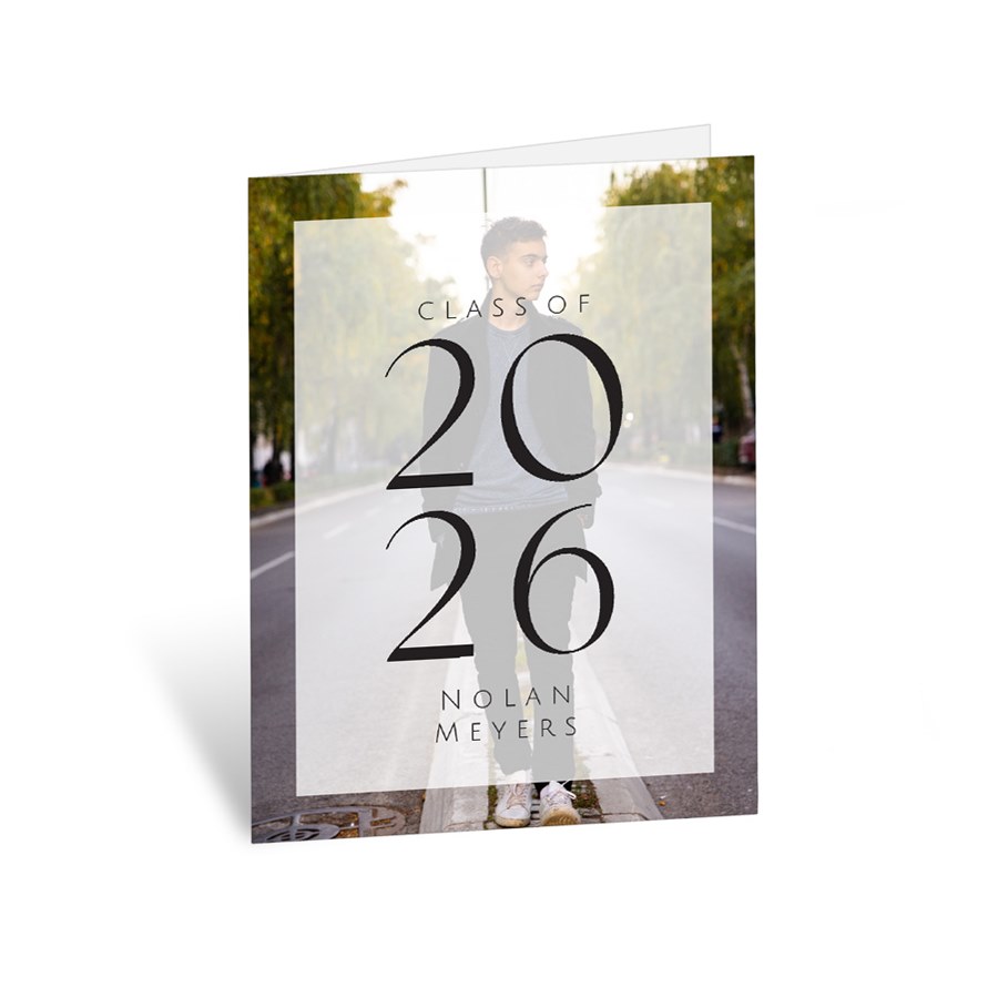 This modern and bold photo Graduation Thank You Note features minimalist style that’s right on-trend. A translucent screen is printed over your photo, and holds their graduating year and any additional custom text you’d like to add.