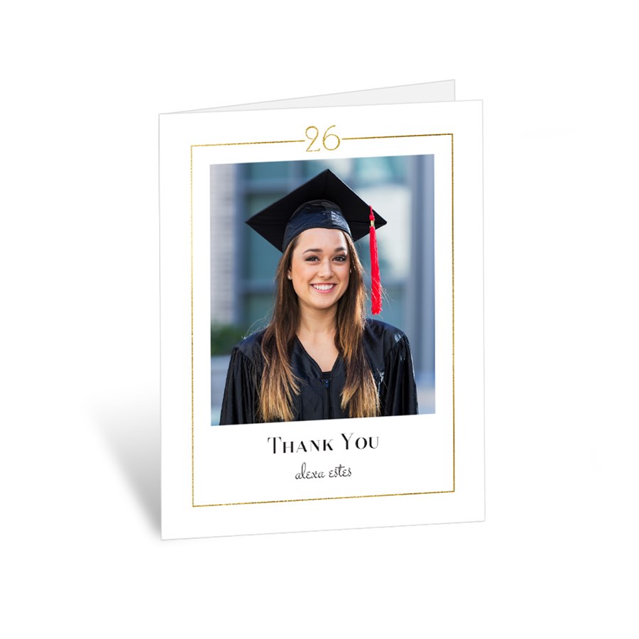 Send a classic thank you note that’s sophisticated and totally personalized. The gold border and graduation year is printed in faux gold foil. The background behind your wording is printed in your choice of color. Text is editable with choice of fonts and colors.
