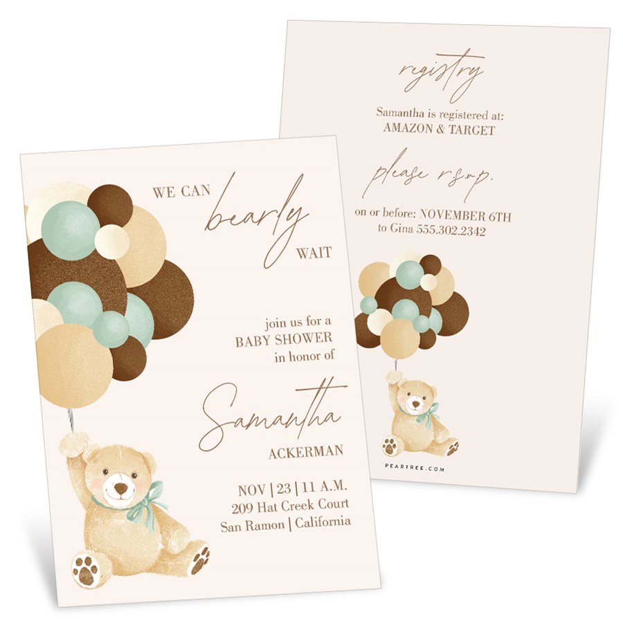 You can bearly wait to throw an cute baby shower with this cuddly design! A cute teddy bear with sage and brown balloons is printed on the front beside your custom wording with a trendy, arch background. Design is printed as shown. Your wording is printed in your choice of colors and fonts. Use the back for more shower details like registry info.