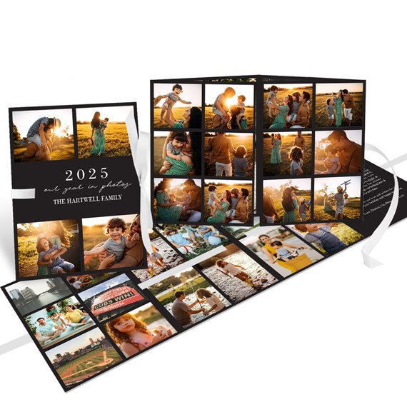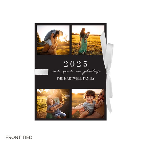 Share your year with all your favorite photos! These ribbon booklets let you share your best shots from the year. Your custom message will print as shown in your choice of color and fonts. These four-panel cards are folded in on both ends and tied with a ribbon. You get to add several photos and your own personalization. You also get to choose from more than 80 colors to enhance the design. Text is editable with choice of fonts and colors.