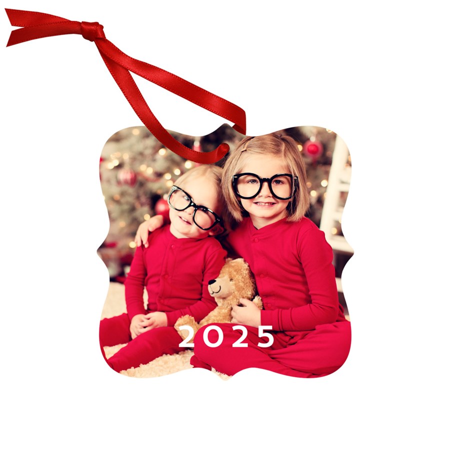 Make a Christmas photo ornament that features your family and year in super cute and simple style! You can change the color of the year, edit and add extra text and personalize your ornament until it’s perfect for you. This personalized ornament is 3" x 3" and made of lightweight .045" coated aluminum with a glossy finish. Your photos are infused into the coating using a revolutionary process that results in vibrant colors and detail. A red ribbon is included for hanging.