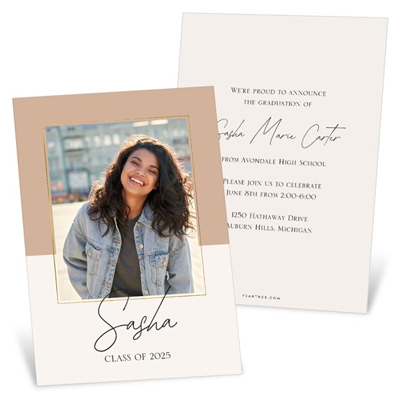 This Color Contrast, beautiful photo Graduation Invitation features a simple gold border with custom colors. The front features your graduate’s photo and any text you choose to add. The gold border around your photo is printed in digital gold ink. With endless layout, color and photo options, this invitation can be customized to suit your personal style, and can also double as your Graduation Announcement.