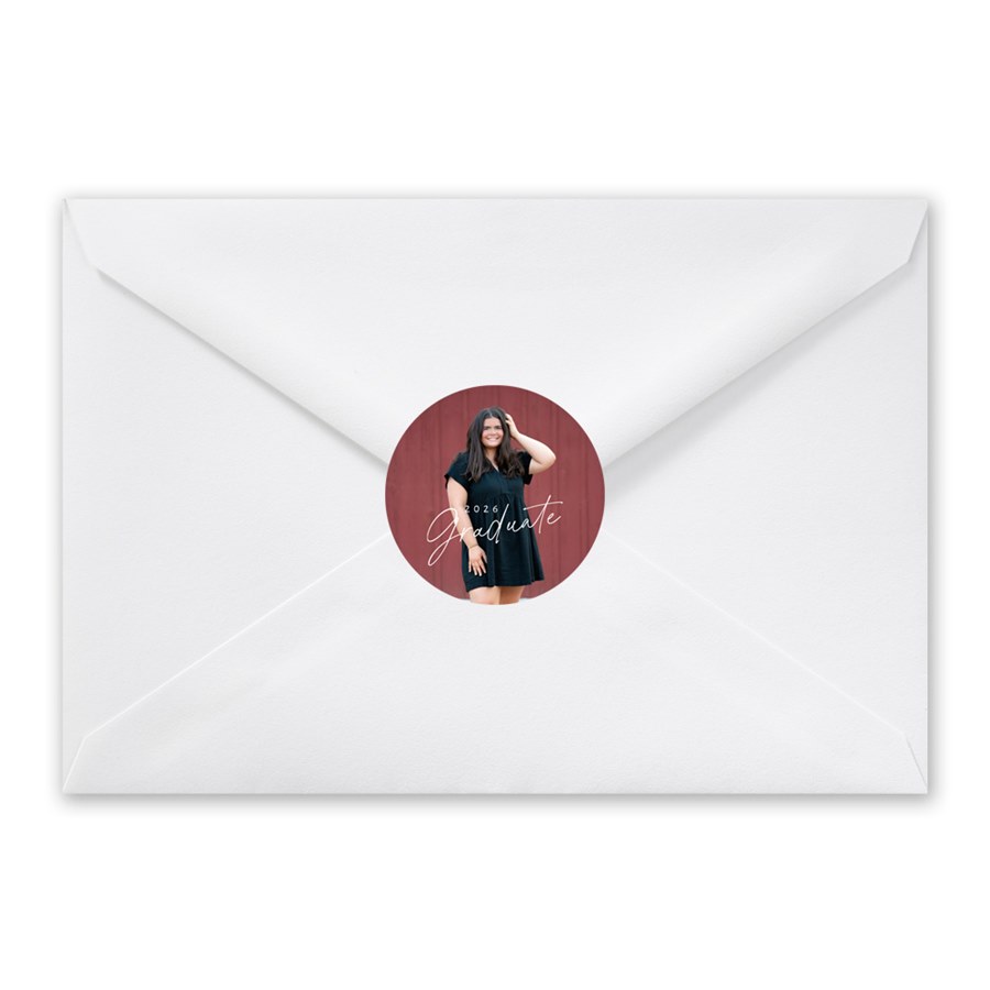 Your graduation announcement envelopes will stand out from the crowd when you add these personalized photo seals. Your grad's year and the word "Graduate" are featured over your favorite photo. You can customize the color and placement of this text. Use them to seal your envelopes or even use them on party favors, paper cups, table cards or serving dishes, or you can stick two together over a toothpick or wooden skewer to create cupcake toppers! These 2" diameter circles come in sheets of 20 adhesive-backed seals per sheet.