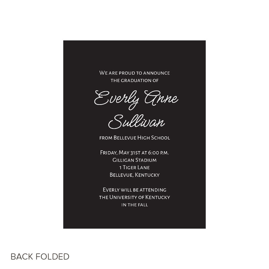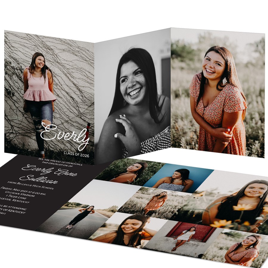 This All Photos, folding graduation party invitation lets you show off lots of photos and doubles as your graduation announcement. The front side of this design features your senior's name and graduation year - in any color you'd like - and three pictures. The backside is also customizable. Choose your colors, fonts and add all the details you wish to share. With space for 8 more senior photos, this design is truly one-of-a-kind.