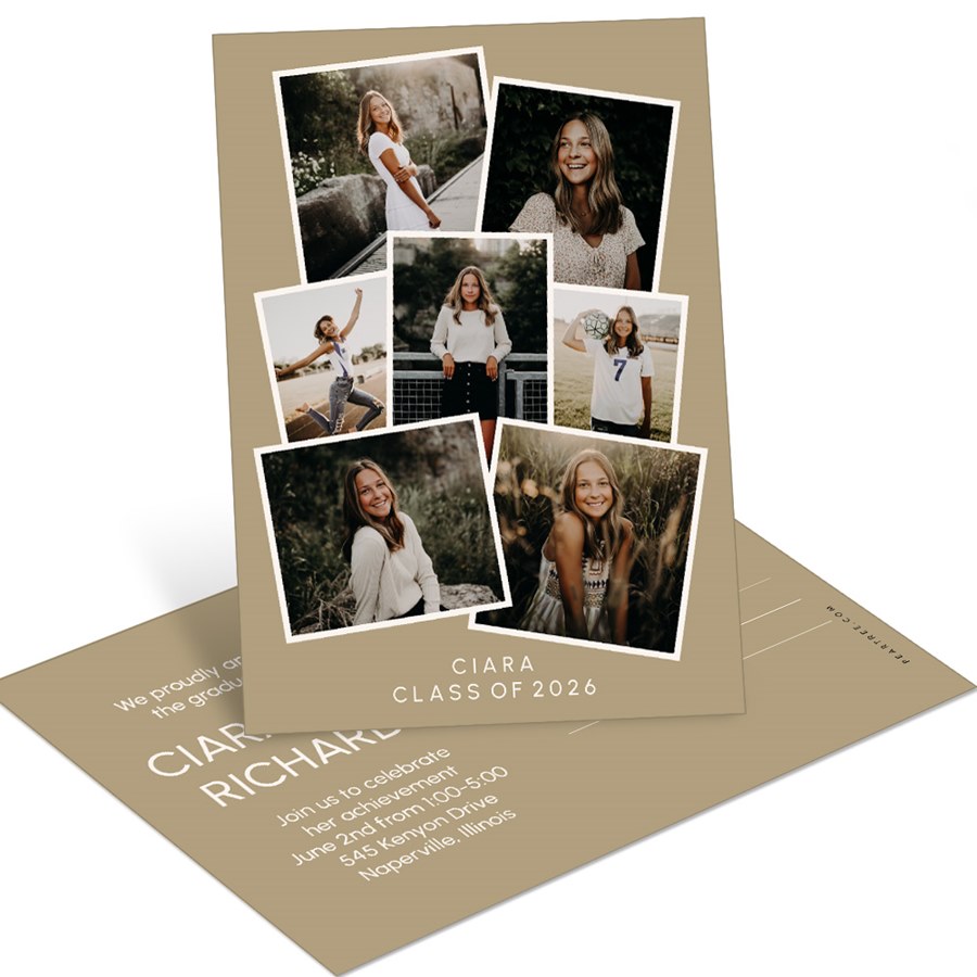 This Featuring the Grad Graduation Announcement Postcard is ready to be personalized just for you! The front side of this design features a photo collage of 7 of your favorite senior photos. You can update the background and photo border colors. The backside features space for your custom text. Each font, color and text can be customized. Remember to use postcard-rate stamps to save on postage!