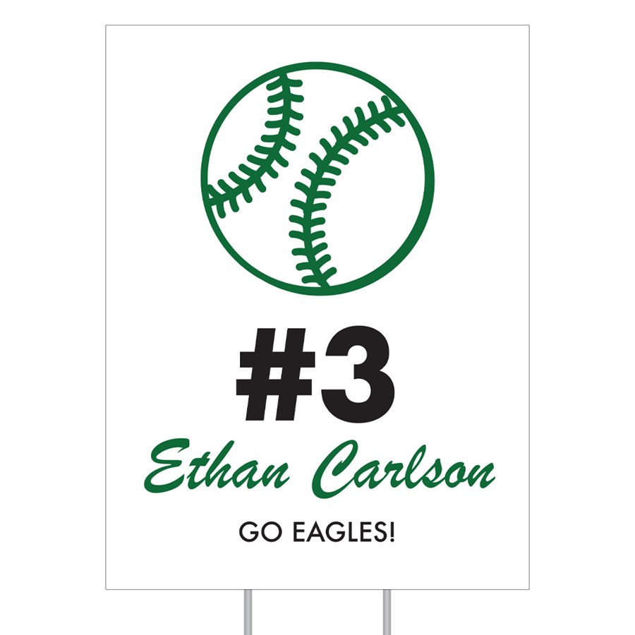 How awesome is this yard sign?! Celebrate your baseball player with a personalized yard sign in your front yard. All the colors can be changed to suit your team colors and style. You can also update the ball color. This yard sign is made from weatherproof, corrugated board and includes a metal H stake for mounting and inserting into the ground. Yard signs are shipped separately from the rest of your order.
