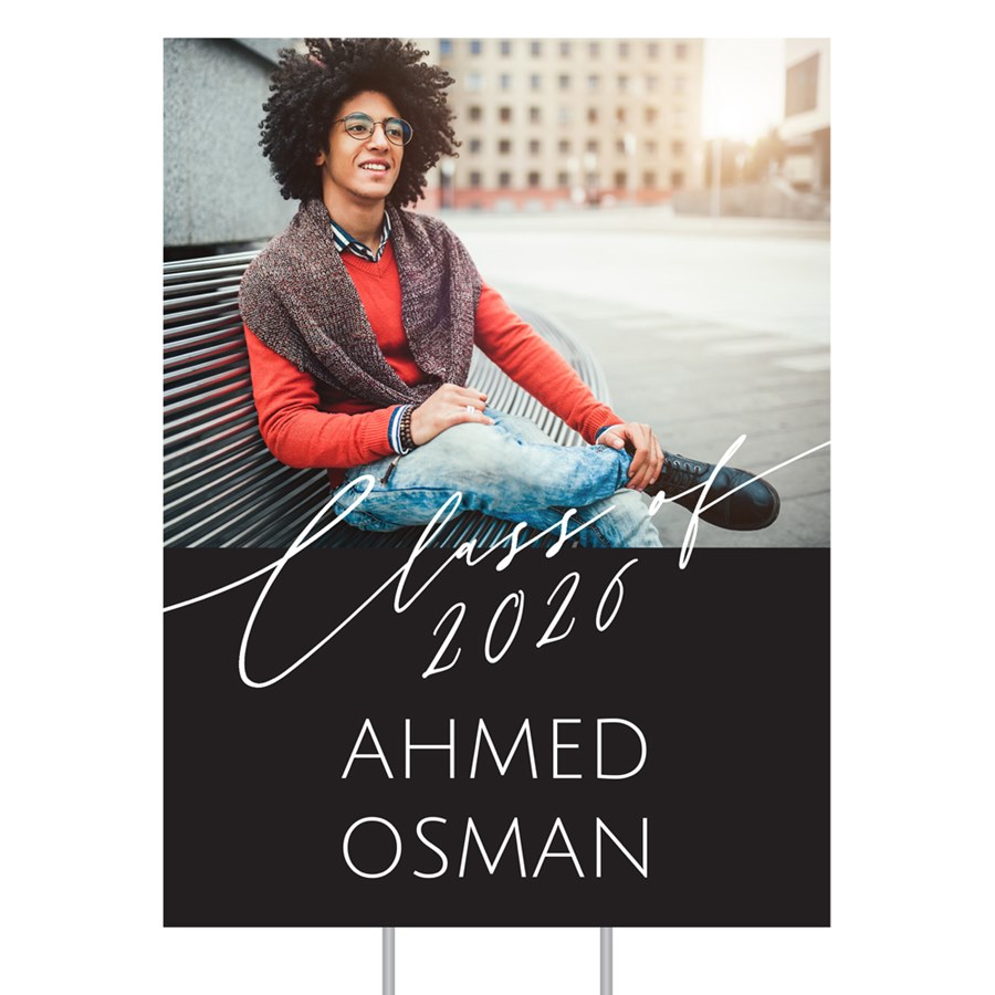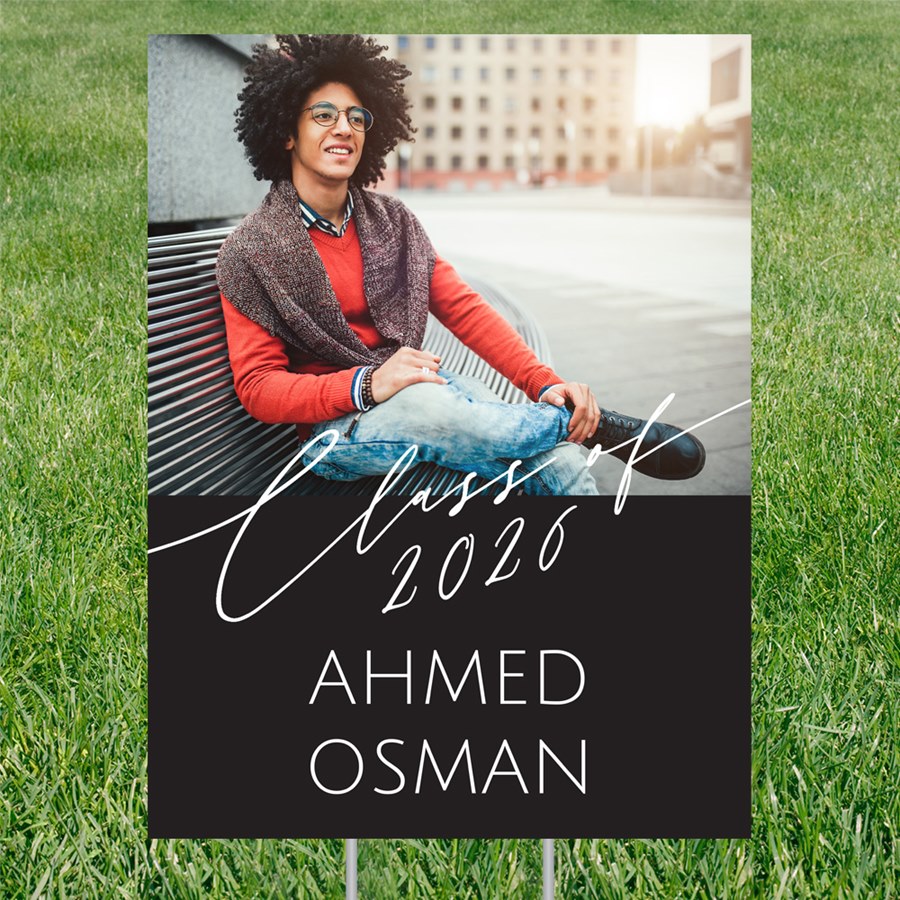 Honor your grad in picture-perfect style with this stunning photo yard sign. Add a photo, personalize the editable text, and then update the colors to suit your style. This yard sign is made from weatherproof, corrugated board and includes a metal H stake for mounting and inserting into the ground. Yard signs are shipped separately from the rest of your order.