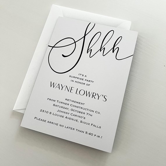 A stunning choice for a surprise retirement party! These retirement party invitations feature "Shhh" on the front with editable text and your choice of background color. You can customize the back with additional party details.