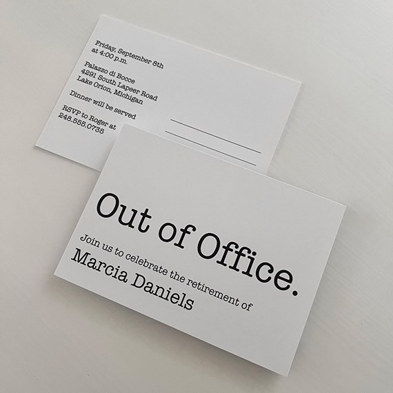 They are out of office for forever! These retirement party postcard invitations feature your custom text, background and font colors. You can update the back with additional party details. Remember to use postcard-rate stamps to save on postage!