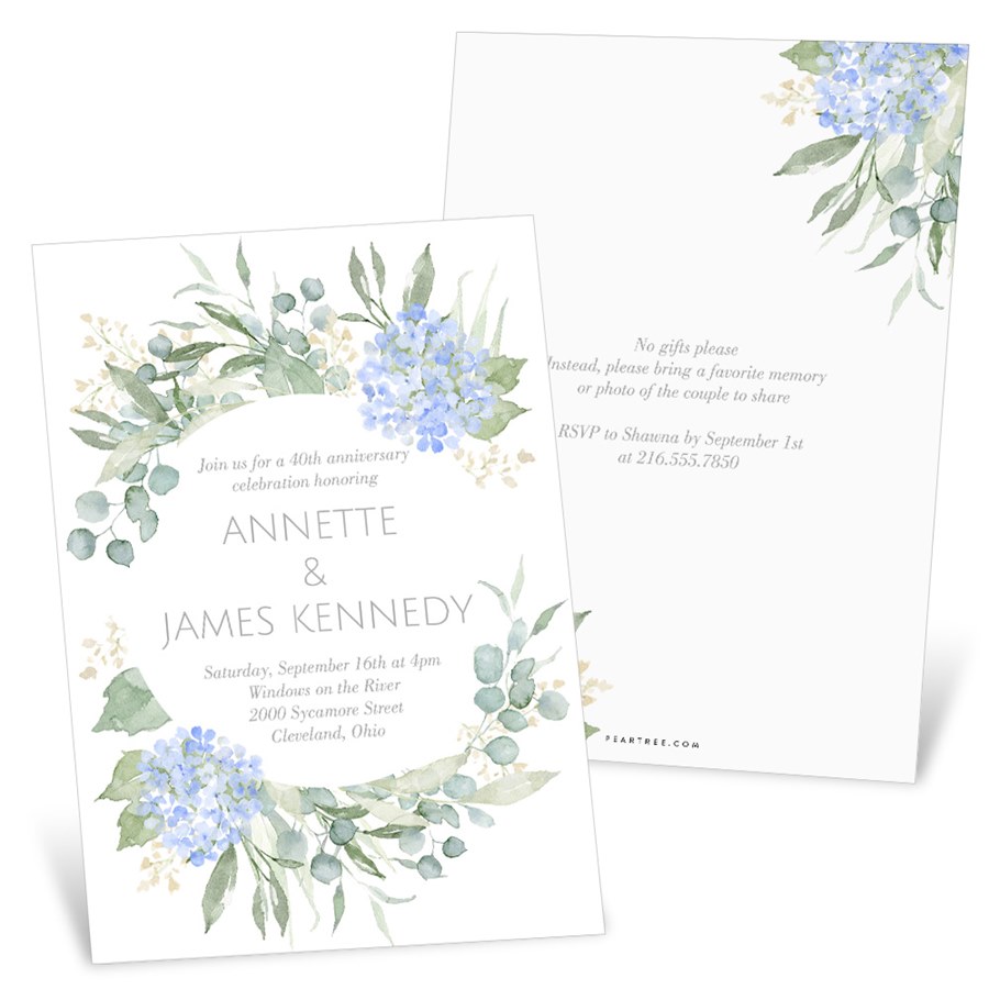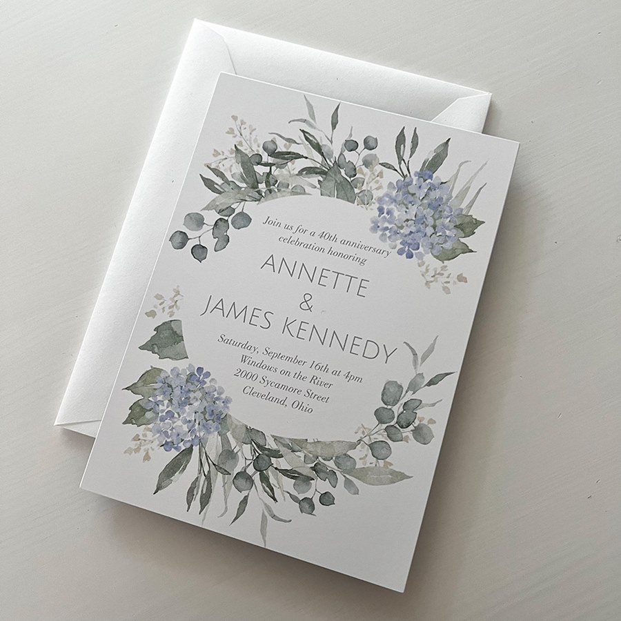 Blue watercolor hydrangeas and garden greenery create a frame around your anniversary party details on this beautifully affordable floral anniversary invitation. These two-sided invitations also offer your choice of wording on the back. You can update all the fonts and font colors to customize your look.