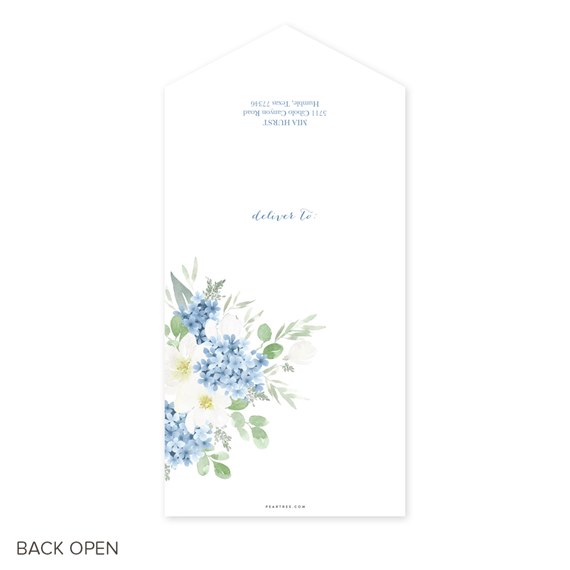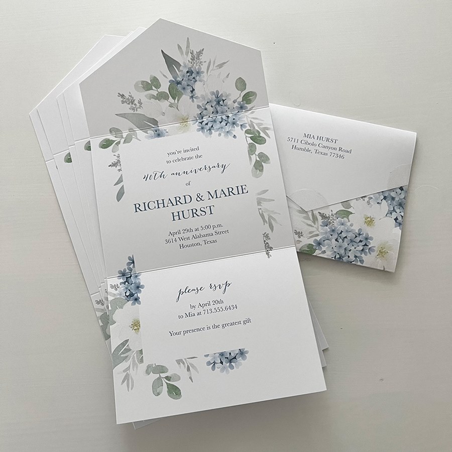 This beautiful all-in-one wedding anniversary invitation features a gorgeous blue and white floral theme. It is a perfect choice for a spring or early summer event. Your return address is printed on the outer flap for a polished look. Your return address is printed on the outer flap for a polished look.