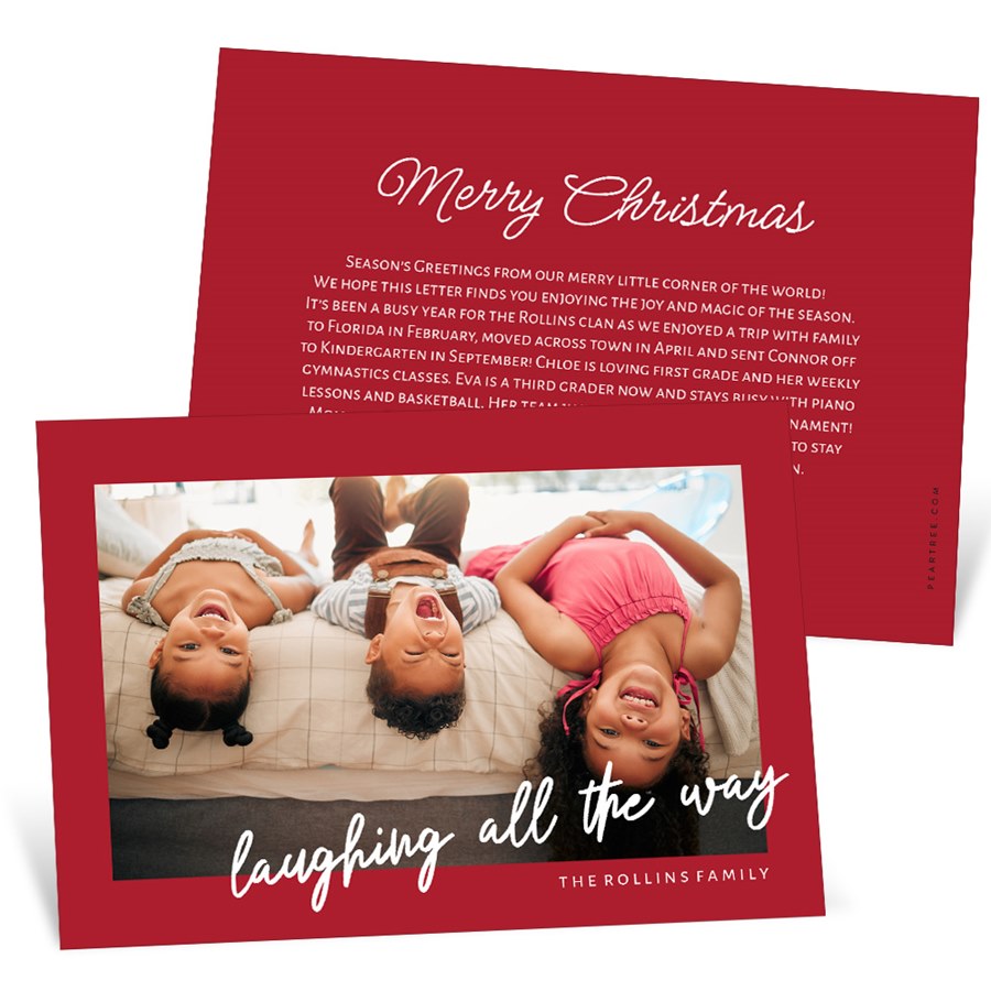 This holiday, send a joyful and sweet Holiday Joy Christmas card that shares the gift of your family. The phrase “laughing all the way" plus your custom wording and photo are featured on the front. You may move the placement of the wording to fit your photo best. Personalize this photo Christmas card, and create a custom look with endless layout, photo, design and text options.