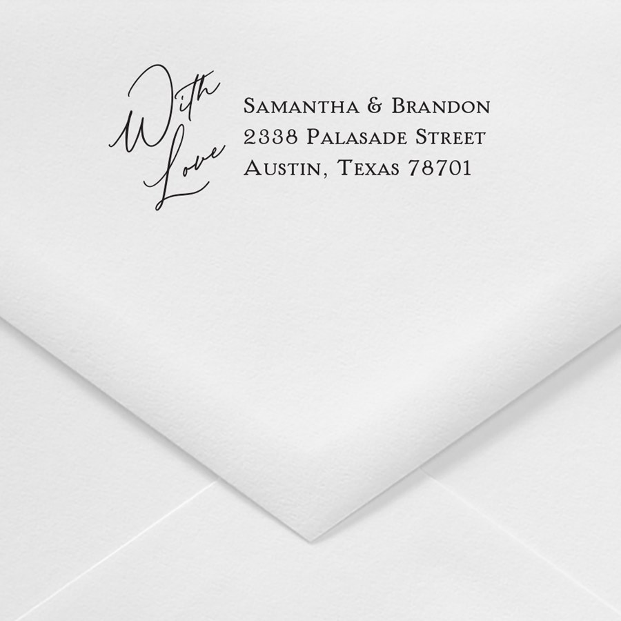Add a personal touch to your envelopes and more with a custom address stamp. Your names and address are featured next to the phrase With Love. You can update the editable fonts to suit your style. This self-inking address stamp is fun way to add a personalized and polished touch to your cards, invitations or announcements.