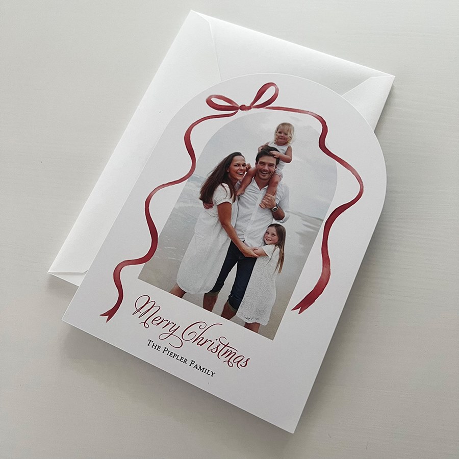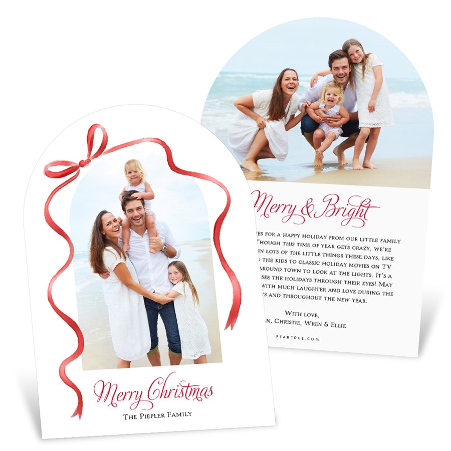 A beautiful Christmas card tied in a bow and oh so beautiful! This cute Tied in a Bow Christmas card features your favorite photo on the front with a red bow with an on-trend arch shape. You may update all of the fonts and wording and the background and font colors on this card can be changed to fit your style. You may also personalize this photo card and create a custom look with endless layout, photo, design and text options.