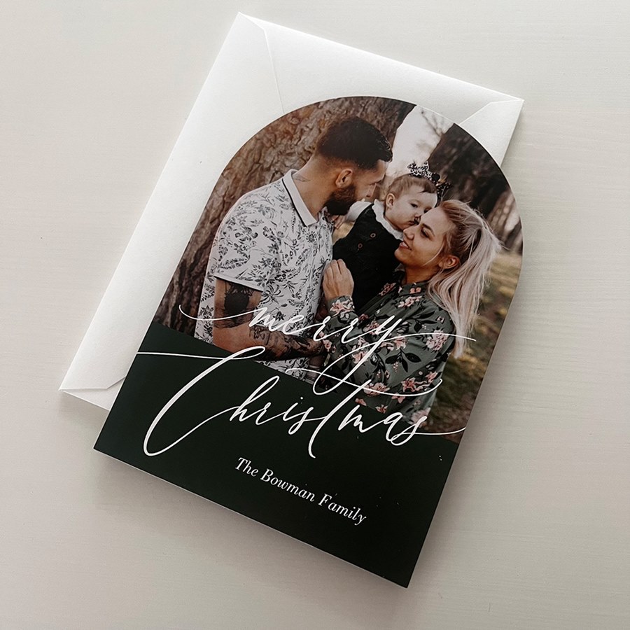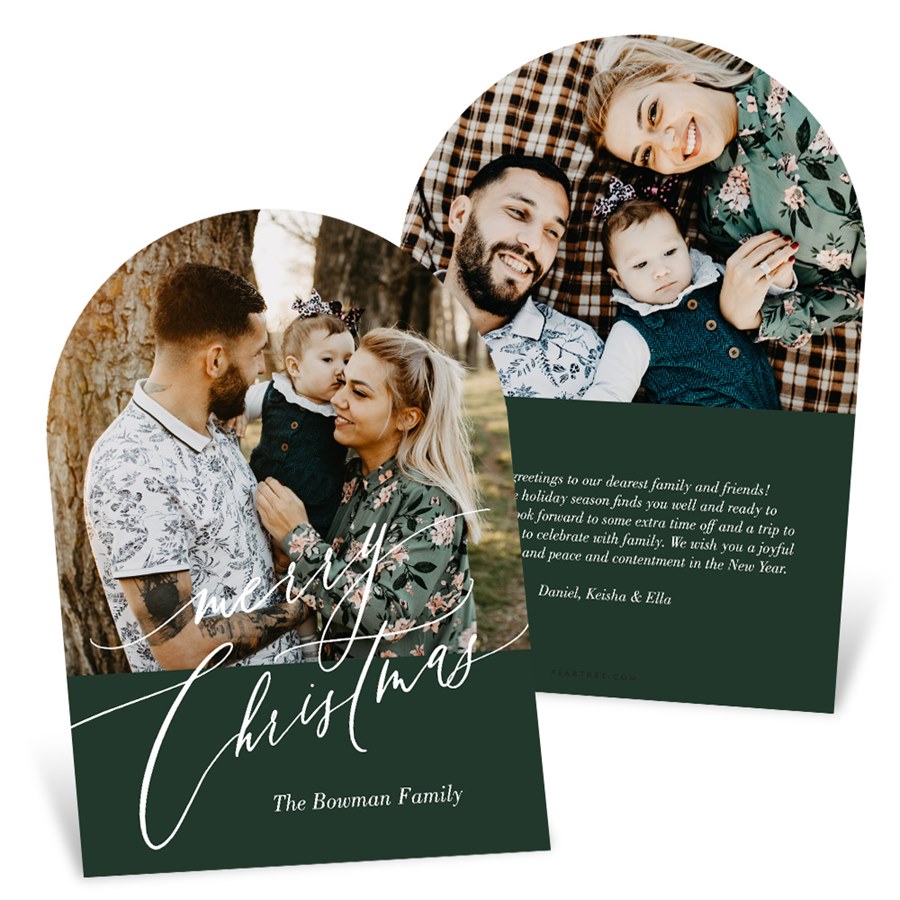 This Festive Flourishes photo Christmas card features an on-trend arch shape paired with classic style. The front features your photo and the phrase "Merry Christmas." You can move the placement of the wording to fit your card best. You may update all the colors to create a design you love. Personalize this photo Christmas card, and create a custom look with endless layout, photo, design and text options.