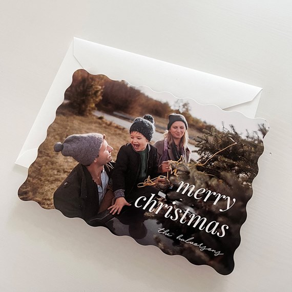 This unique Scalloped Image photo Christmas card features scalloped edges for a fun touch to send to your family and friends. The front features your photo and custom text. You may update all the colors to create a design you love. Personalize this photo Christmas card, and create a custom look with endless layout, photo, design and text options.