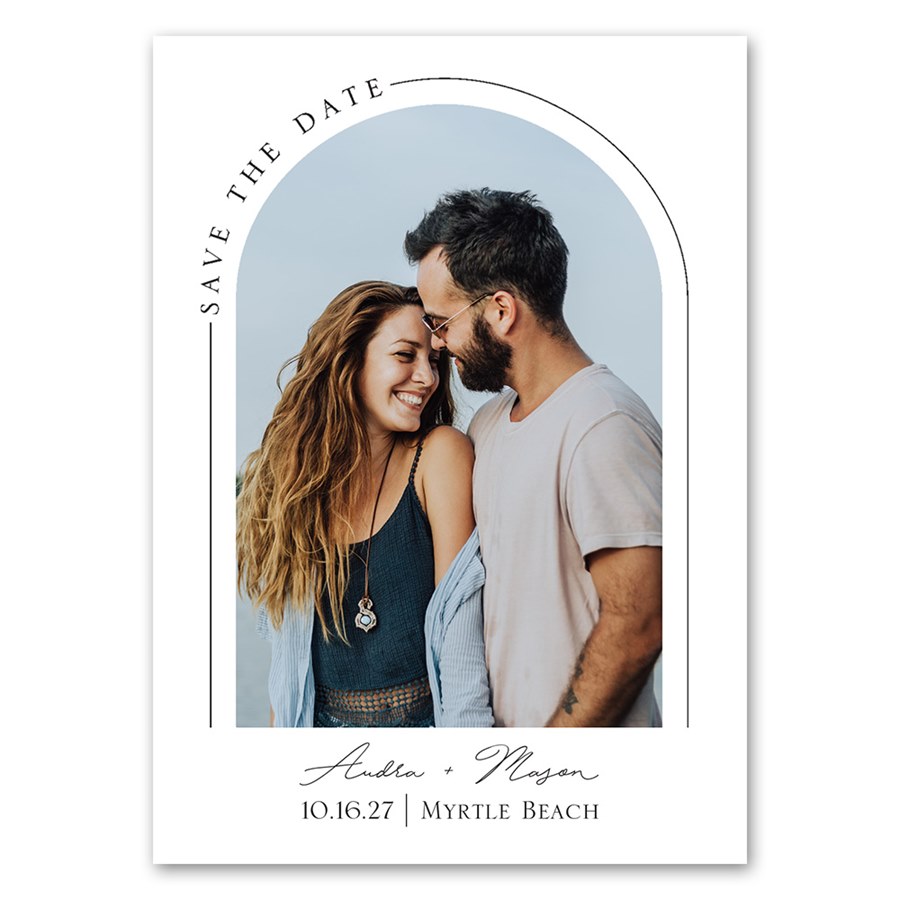 This arch-themed save the date magnet pairs minimalist styling with an affordable price. Add your photo, then update the details. You can change the background color and wording colors to create a custom look. You may also update the text on the editable wording to suit your style.