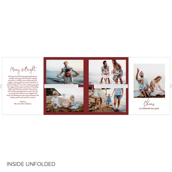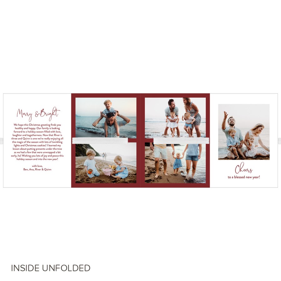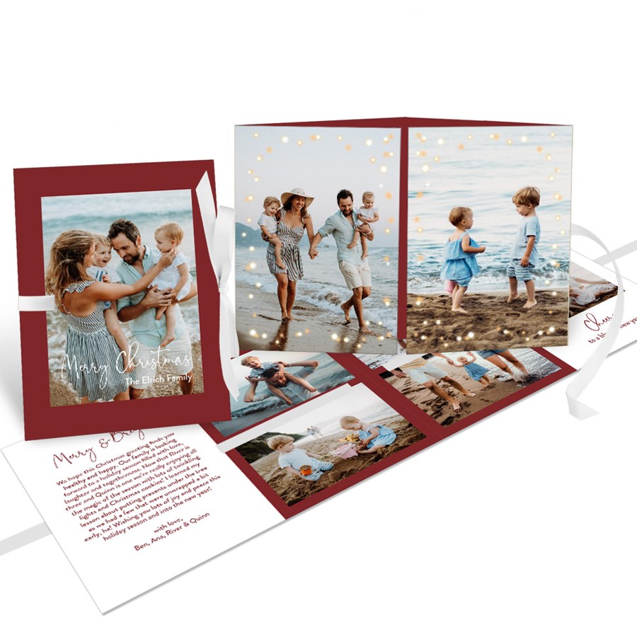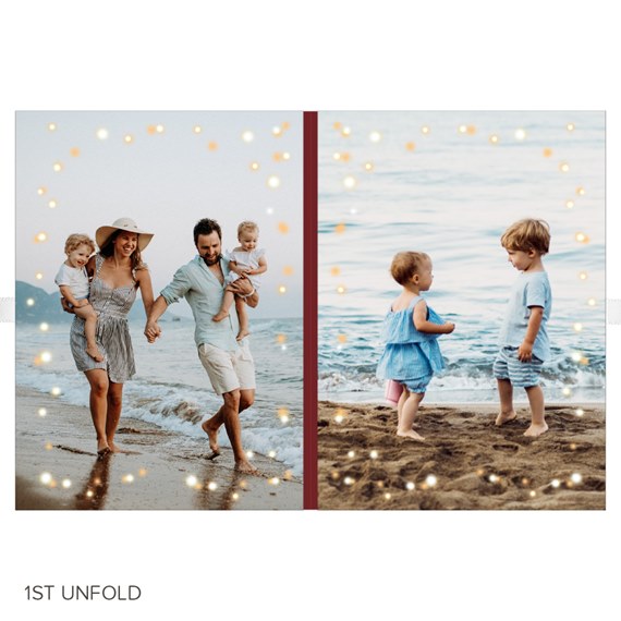 This Framed in Lights Christmas card features your family's favorite photos in a booklet style card that'll knock your socks off. The outside features twinkling lights around your photos. The gold details on this photo card are printed using golden ink. These four-panel cards are folded in on both ends and tied with a ribbon. Personalize this photo Christmas card, and create a custom look with endless layout, photo, design and text options.
