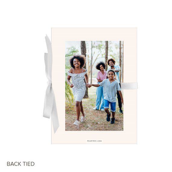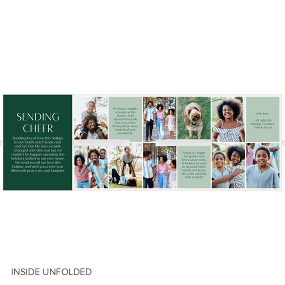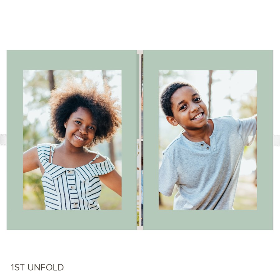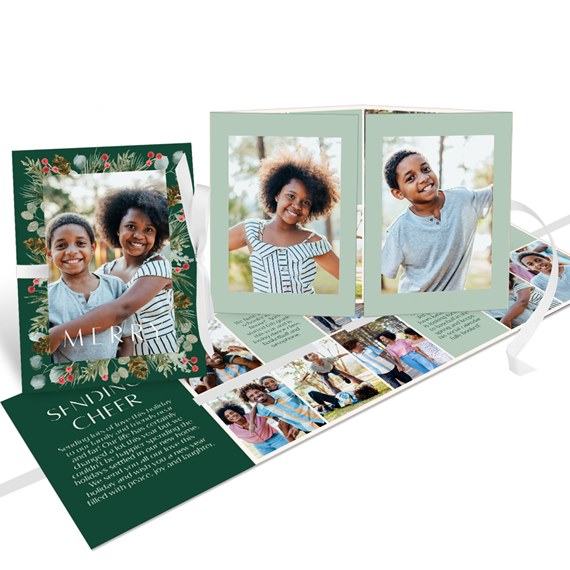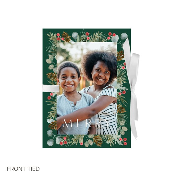This holiday, send this Festive Garland Christmas card that’s beautiful and unique. This folding booklet style card features gorgeous, holiday greenery around your photo on the front. You may update all the background colors, fonts and text colors to fit your style. These four-panel cards are folded in on both ends and tied with a ribbon for a presentation that is truly one-of-a-kind. Personalize this photo Christmas card, and create a custom look with endless layout, photo, design and text options.