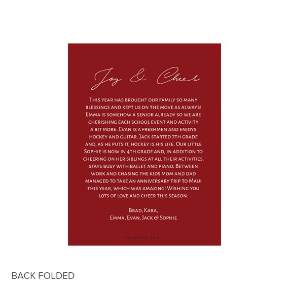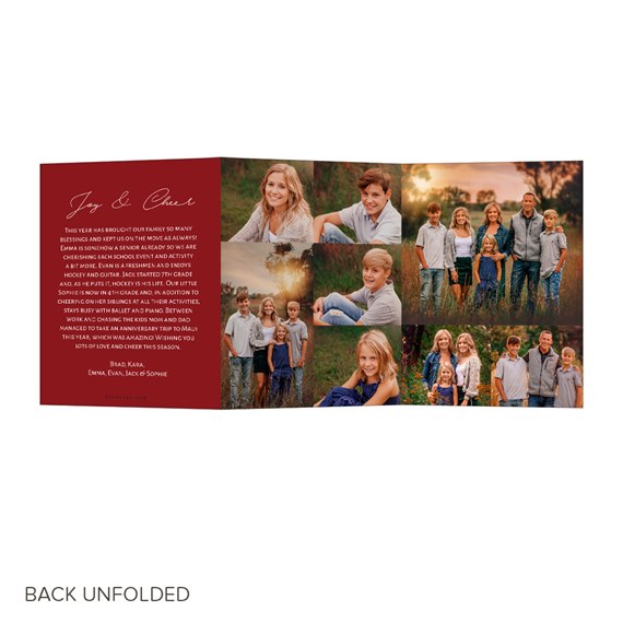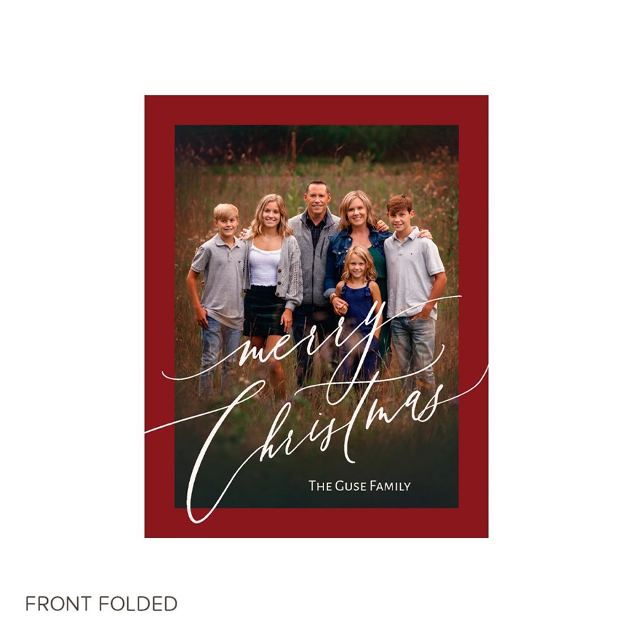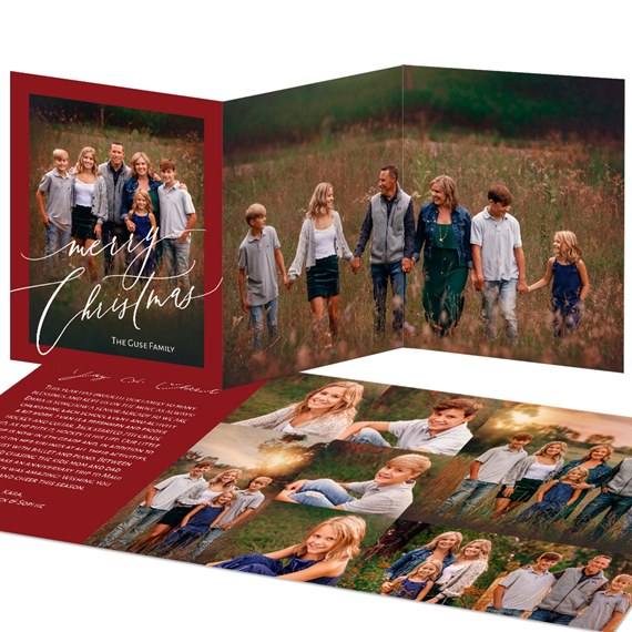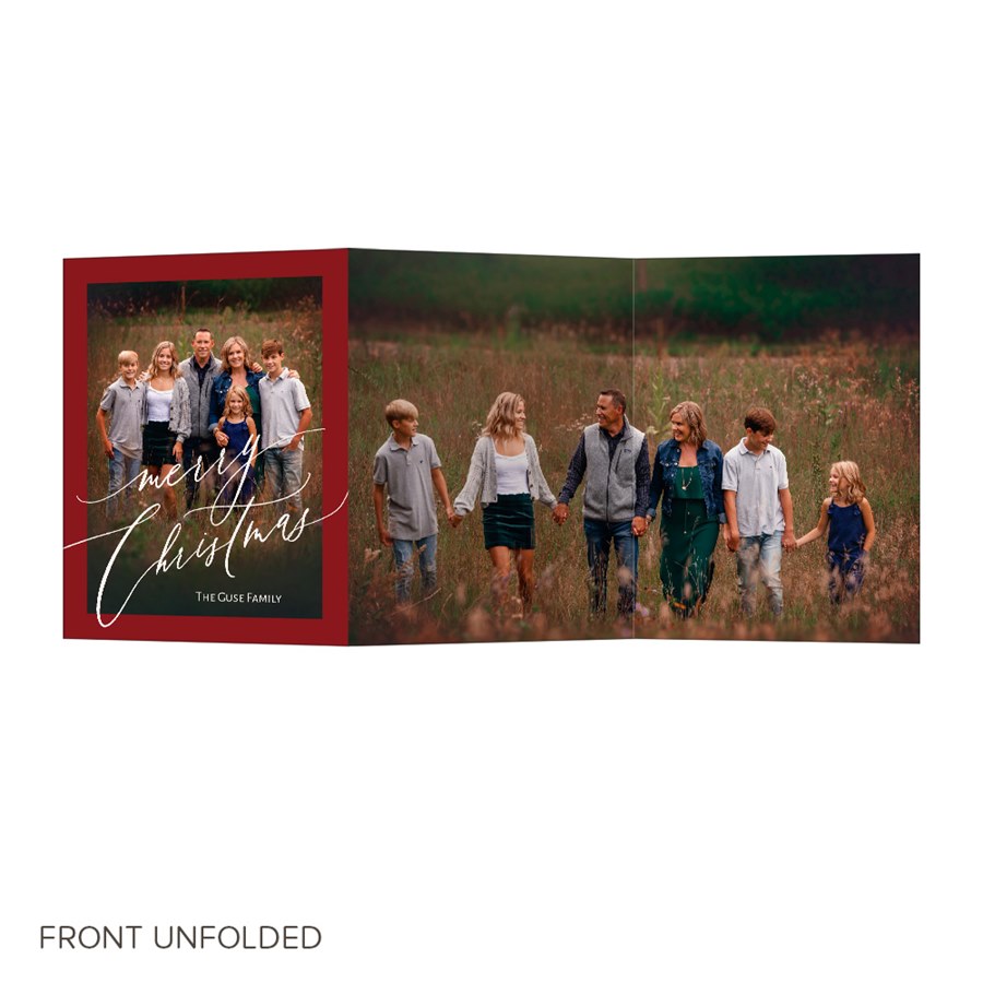This trifold, Merry Calligraphy, holiday card is so sophisticated and stunning! The front features 2 of your favorite photos, a framed border in the color of your choice and the phrase “Merry Christmas” on the left panel. You can move the placement of the wording to fit your card best. This folding card features lots of photos and space for a personalized message. Customize this photo Christmas card, and create a custom look with fun color and text options.