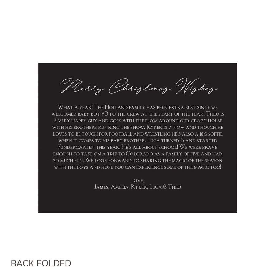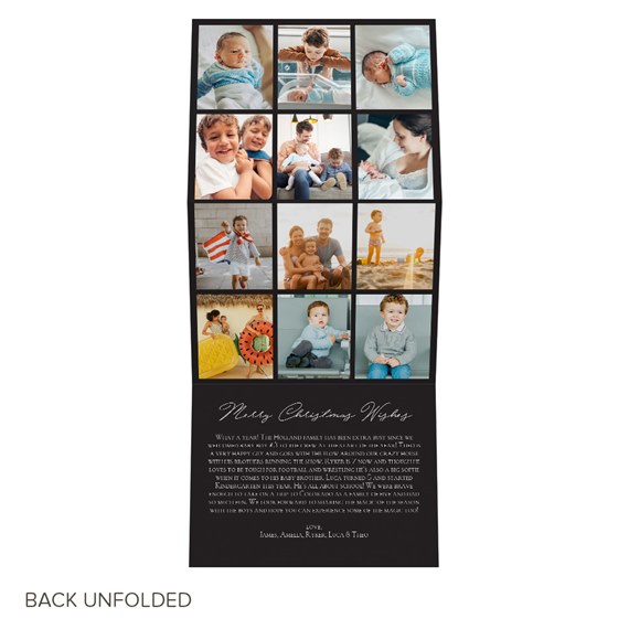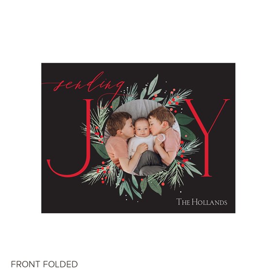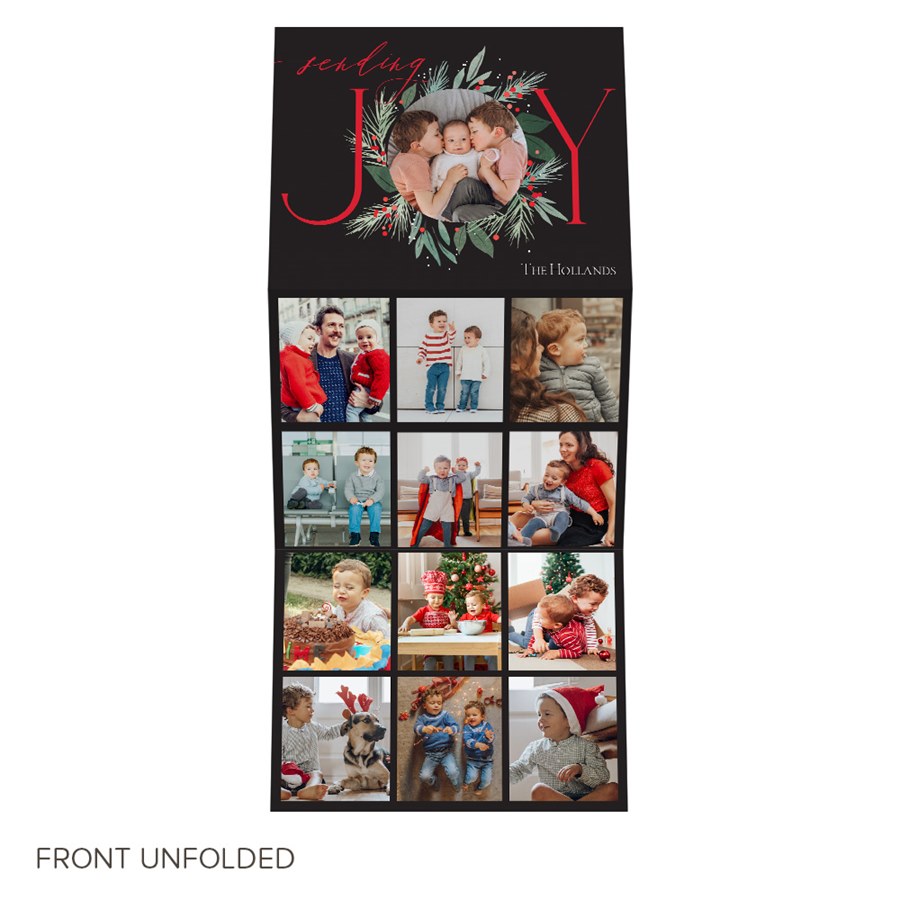 A delightful gathering of all your Joyful Images and family photos with holiday greenery is a festive and gorgeous way to send holiday greetings this season! This vertical, trifold Christmas card features a collage of photos. The phrase, "Sending Joy" is featured at the top with holiday greenery surrounding your photo. The wording and background colors on this card can be changed to fit your style. This trifold holiday card allows you to add several photos plus your own personalized greeting for a look that's all yours.