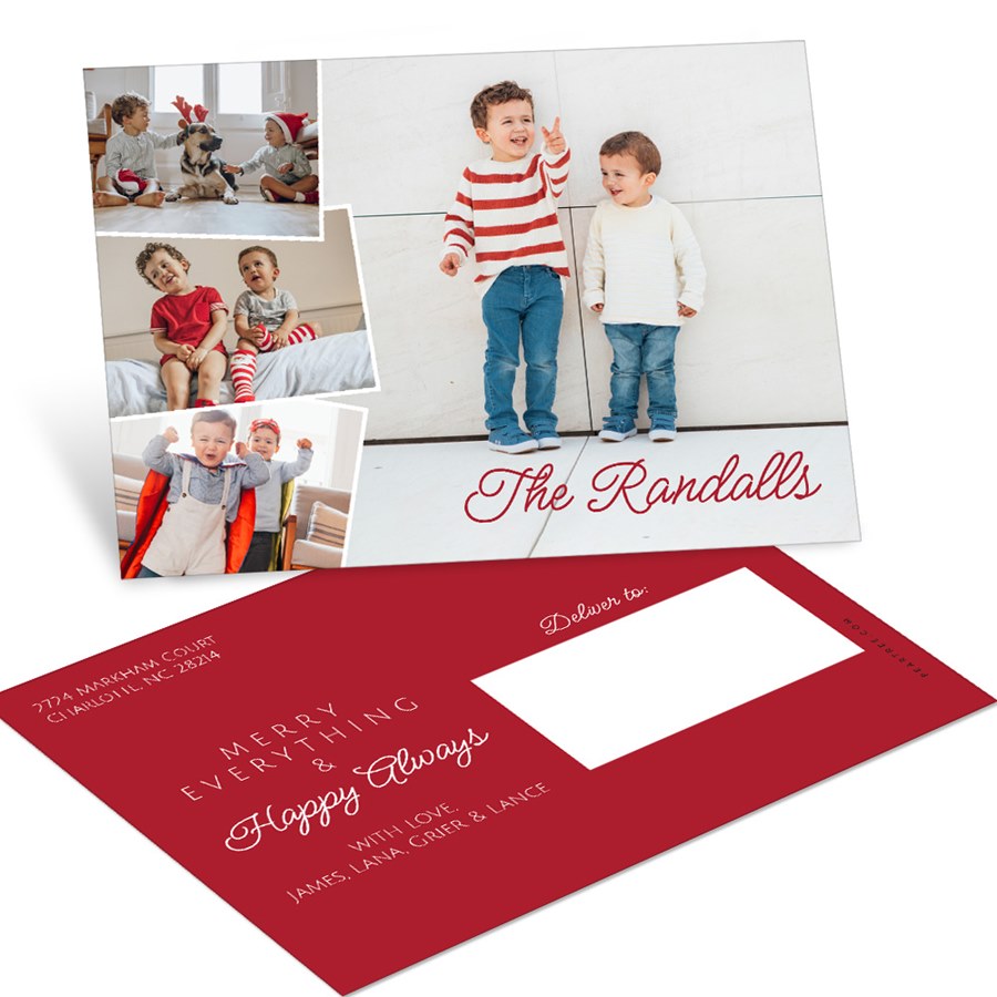 This cute, Side Collage Christmas Postcard features your favorite photos, plus the custom colors and fonts of your choice. The front features 4 of your photos. On the backside, add your custom text and customize your colors. Remember to use postcard-rate stamps to save on postage!
