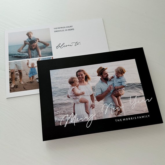 This holiday, send a message of New Year cheer and Merry Christmas tidings! This Merry New Year Postcard features the words “Merry New Year” over your photo. You may move the wording and change the colors to best fit your photo. On the backside, add 2 more photos with your custom text and customize your colors. Remember to use postcard-rate stamps to save on postage!