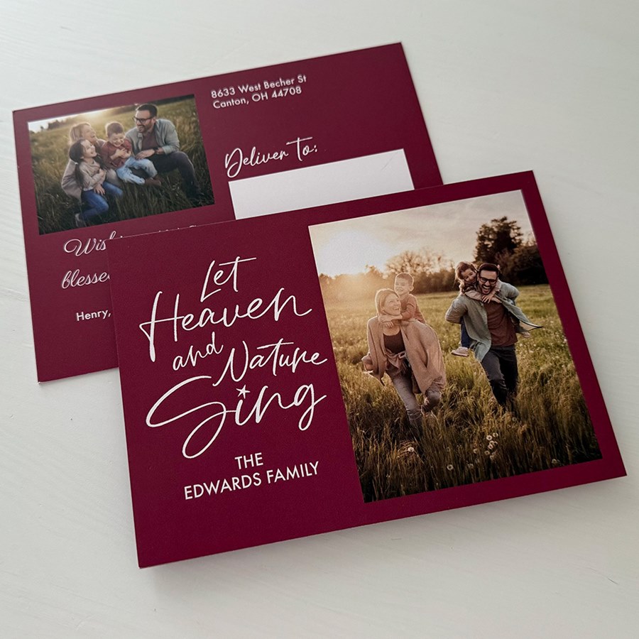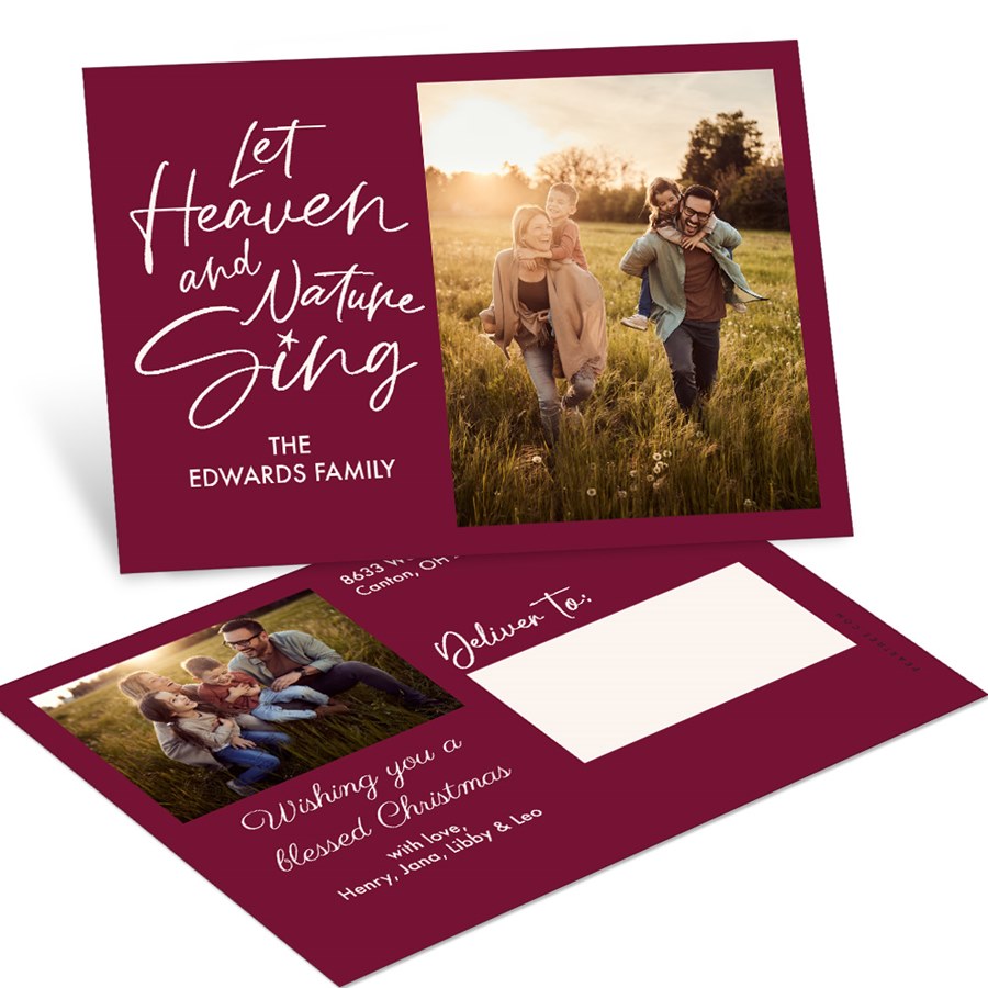 This religious themed The Heavens Rejoice Postcard features your photos, along with custom wording. The phrase, “Let Heaven and Nature Sing” is featured at the front. You may update all the colors to create a design you love. Remember to use postcard-rate stamps to save on postage!