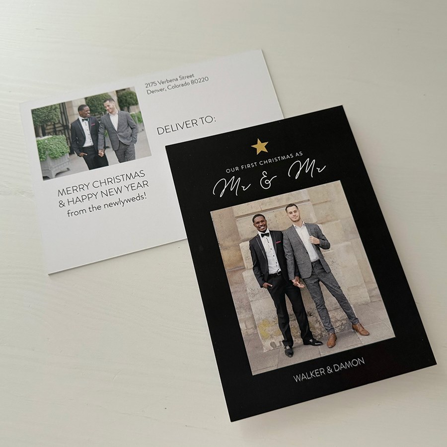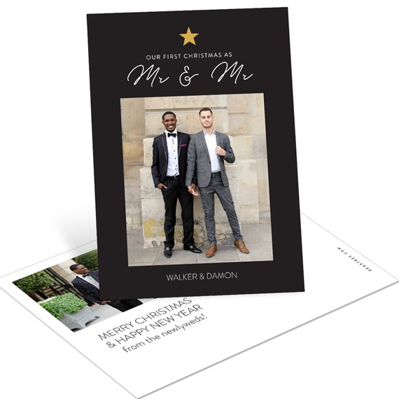 This stunning, Our First Christmas - Mr. and Mr. Christmas Postcard includes your custom holiday message and favorite photo. This holiday postcard features the phrase “Our First Christmas as Mr & Mr” on the front with a simple star to celebrate your first Christmas together! You may move the placement of the wording to fit your photo best. On the backside, add 1 more photo with your custom text and customize your colors. Remember to use postcard-rate stamps to save on postage!